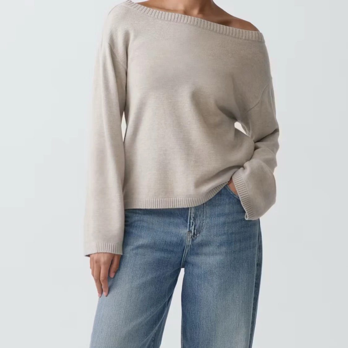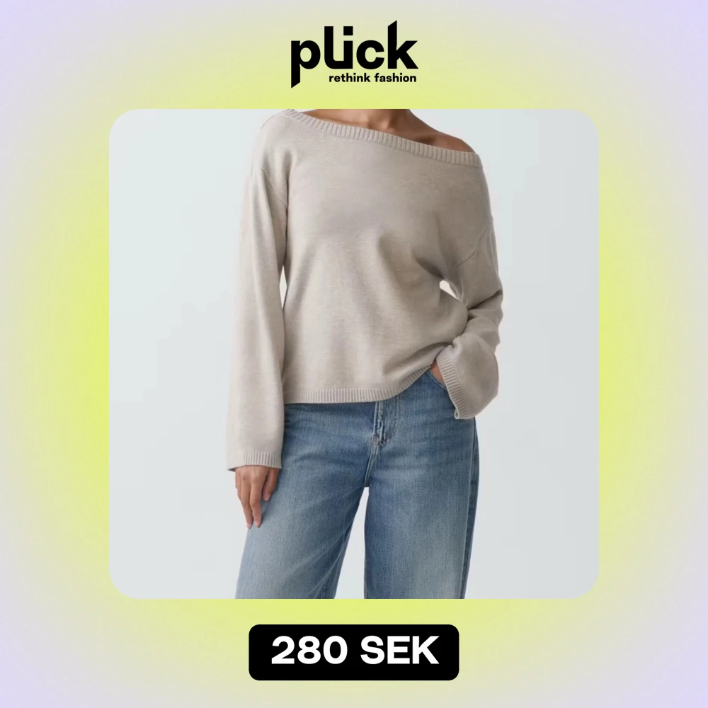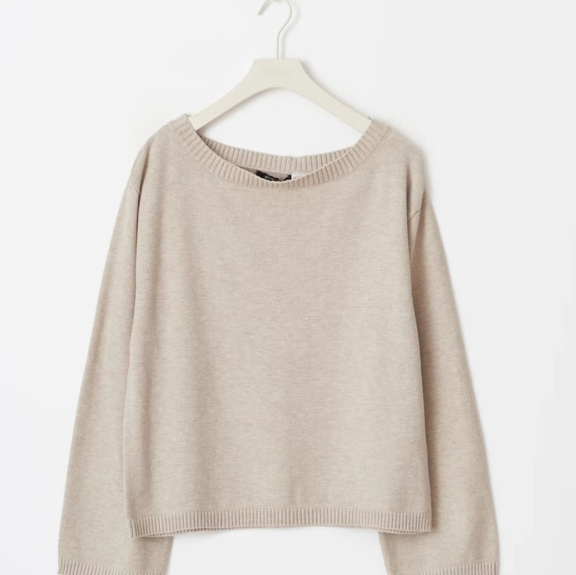 Säljer en supermysig beige stickad tröja med en avslappnad passform. Den har långa ärmar och en bred halsringning som ger en offshoulder-look. Perfekt för både höst och vår, och funkar lika bra till jeans som till kjol.