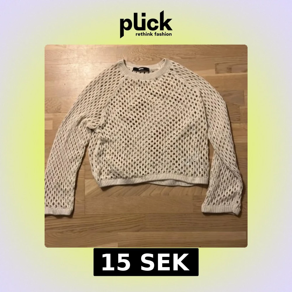 Säljer en beige stickad tröja från BikBok med ett luftigt hålmönster. Tröjan har långa ärmar och ribbade kanter vid hals, ärmslut och nederkant.