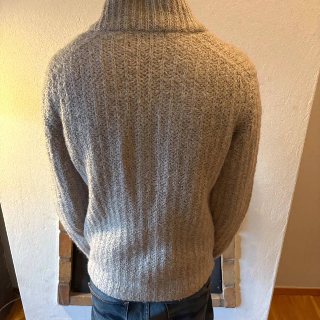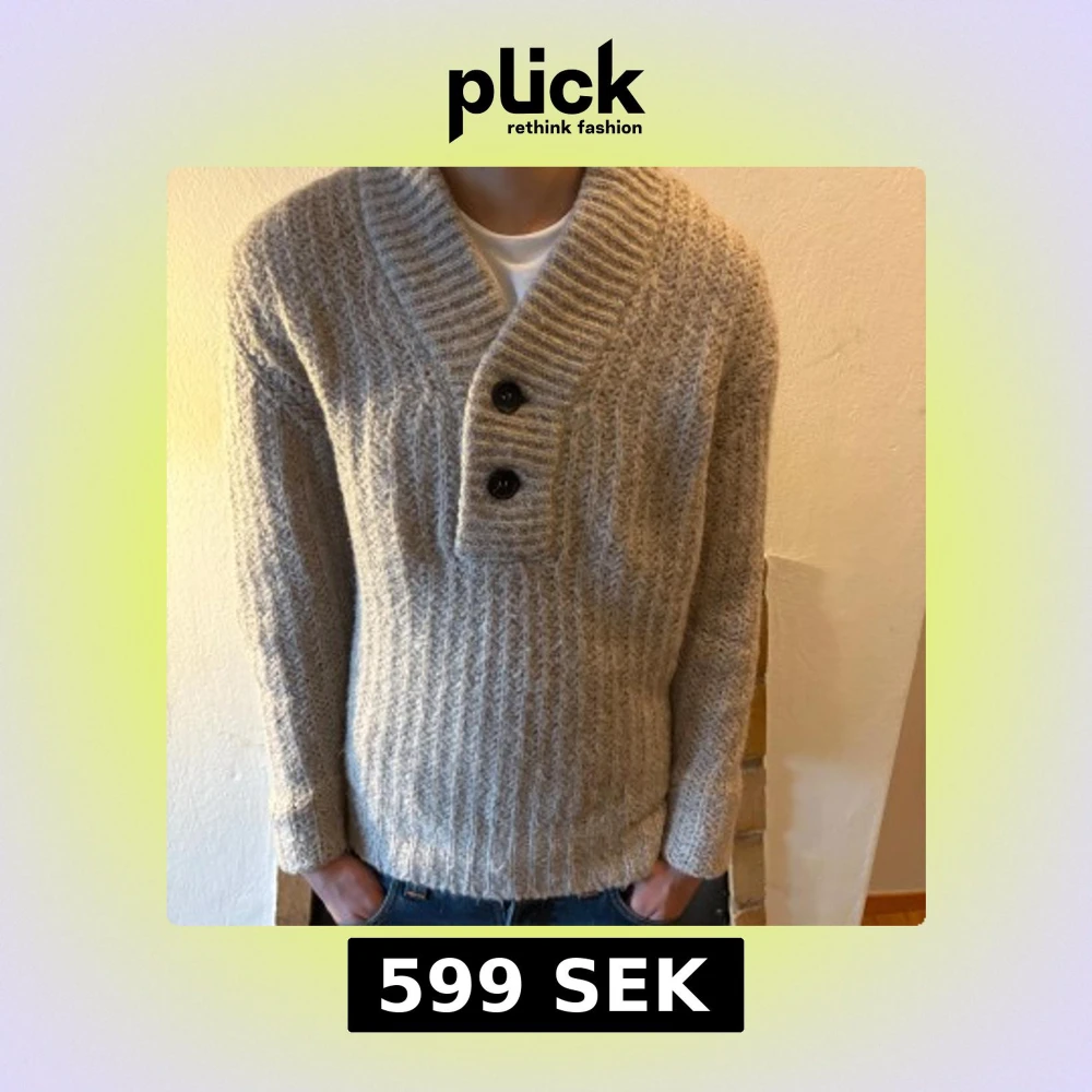 Säljer en snygg beige stickad tröja från Burberry med två knappar framtill. Tröjan har en ribbad struktur och långa ärmar, perfekt för kyligare dagar. Den har en stilren design med en liten metallplatta med logotypen på framsidan.