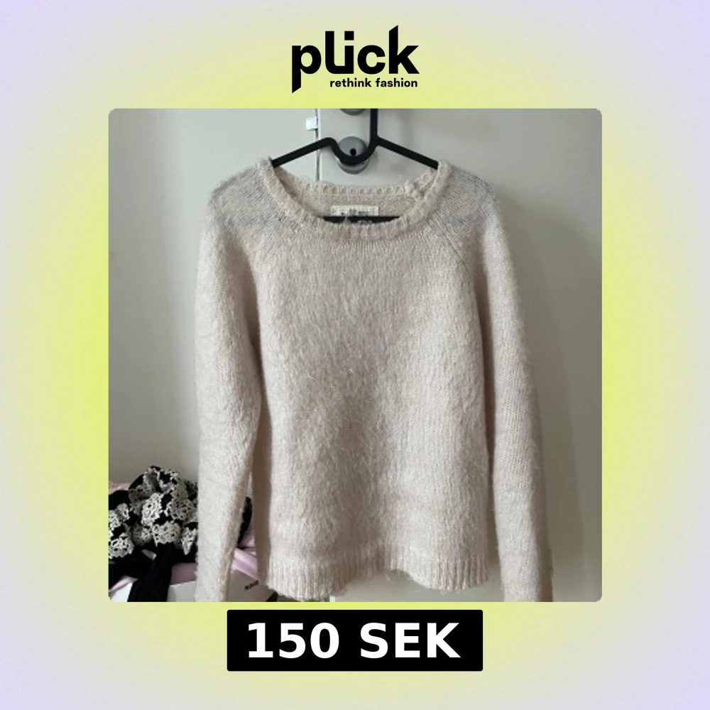 Mysig beige stickad tröja. Perfekt för kyliga dagar med sin mjuka och fluffiga textur. Tröjan har en rund halsringning och långa ärmar.