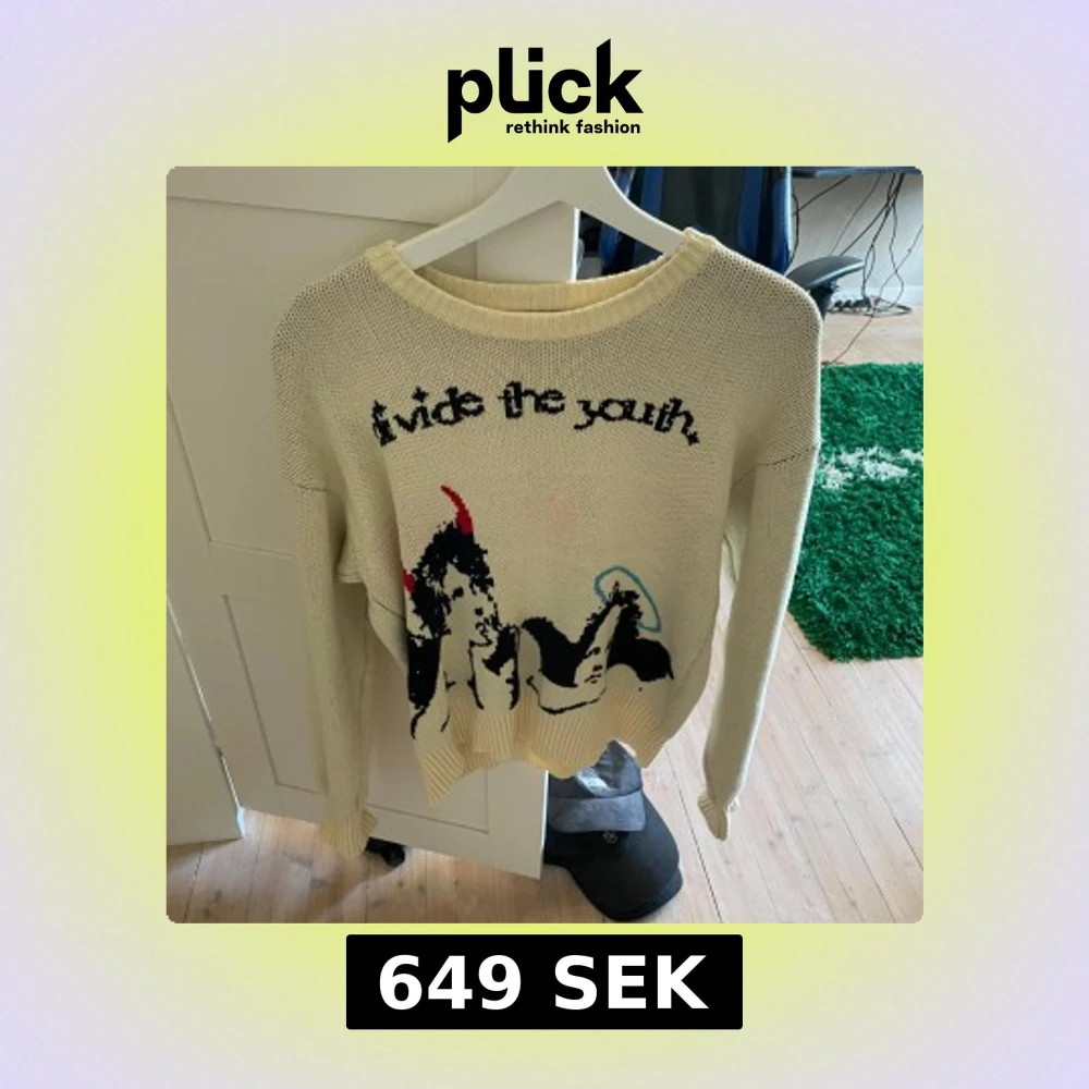 Säljer en beige stickad tröja från Divide The Youth med svart text och grafiskt motiv framtill. Tröjan har rund halsringning och långa ärmar. Perfekt för dig som vill ha något unikt och trendigt i garderoben.