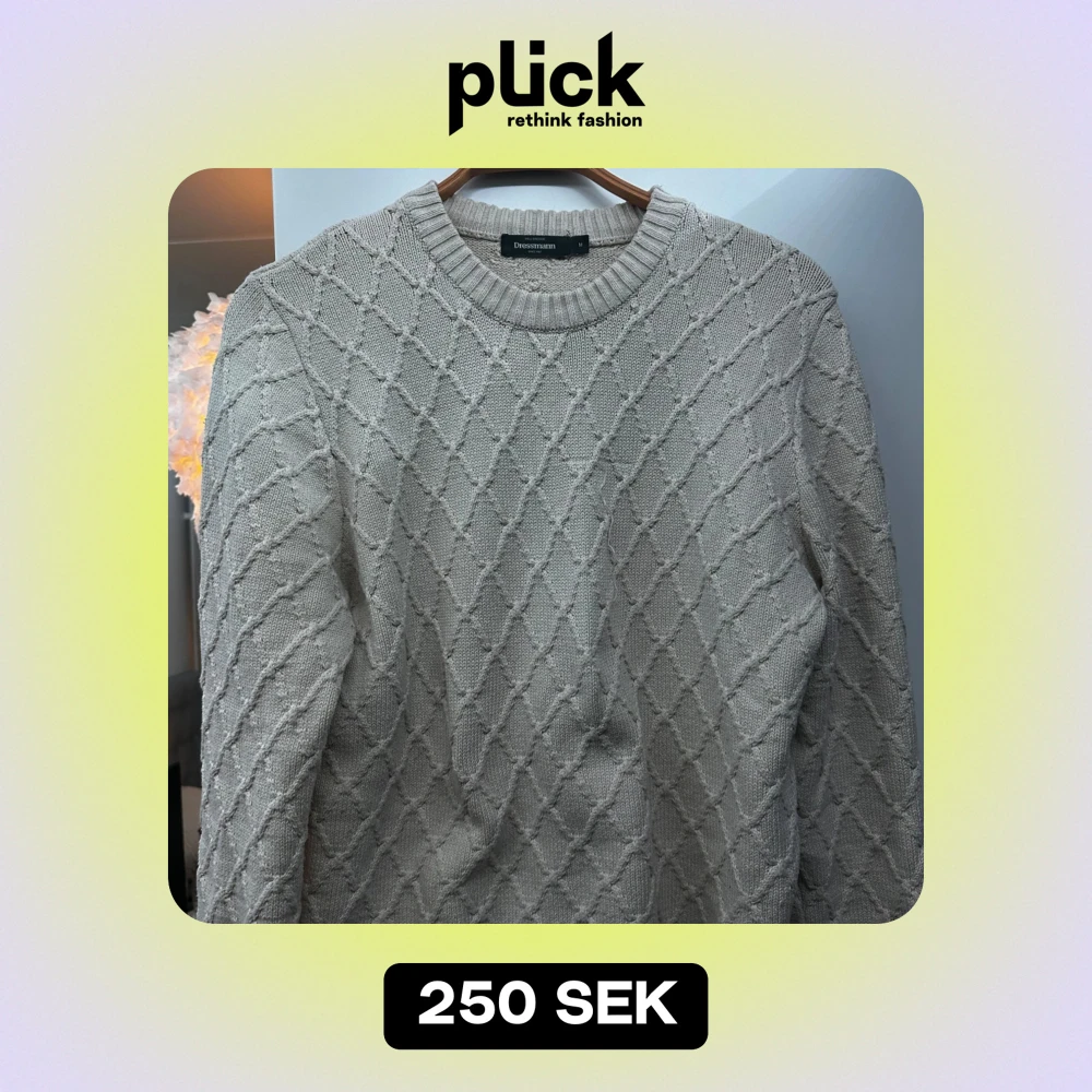 Säljer en snygg beige stickad tröja från Dressmann i storlek M. Tröjan har ett diskret rutmönster och är perfekt för kyliga dagar. Den är långärmad och har en klassisk rund halsringning. Perfekt för både vardag och lite finare tillfällen.