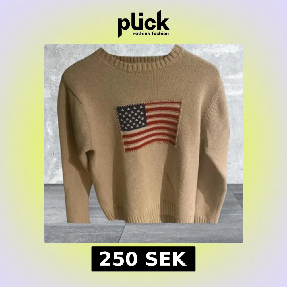 Säljer en beige stickad tröja från GANT med ett amerikanskt flaggmönster på framsidan. Tröjan har långa ärmar och ribbstickade detaljer vid hals, ärmslut och nederkant. Perfekt för en avslappnad stil.
