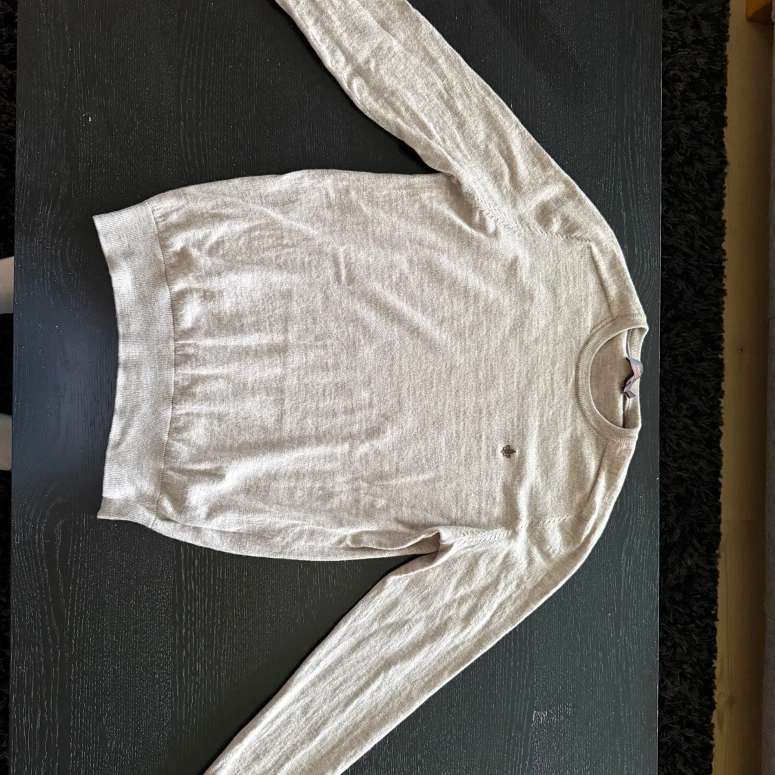 Säljer en stilren beige stickad tröja från Morris med rund halsringning och som passar till många olika outfits. Tröjan har krympt lite i tvätten så skulle klassa tröjan som S/M