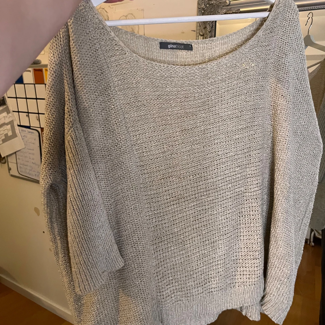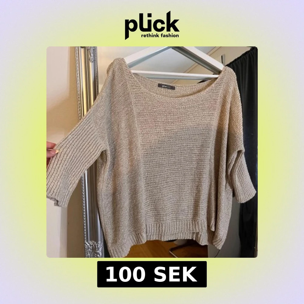 Beige stickad tröja från Gina Tricot med avslappnad passform och bred halsringning. Tröjan har trekvartsärmar och ribbade muddar vid ärmslut och nederkant. Perfekt för lager-på-lager och chill vibes.