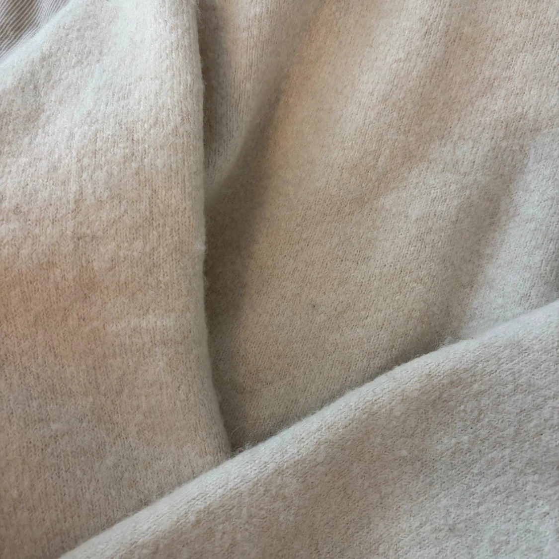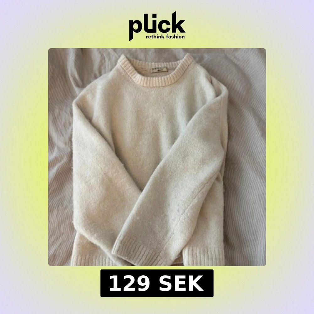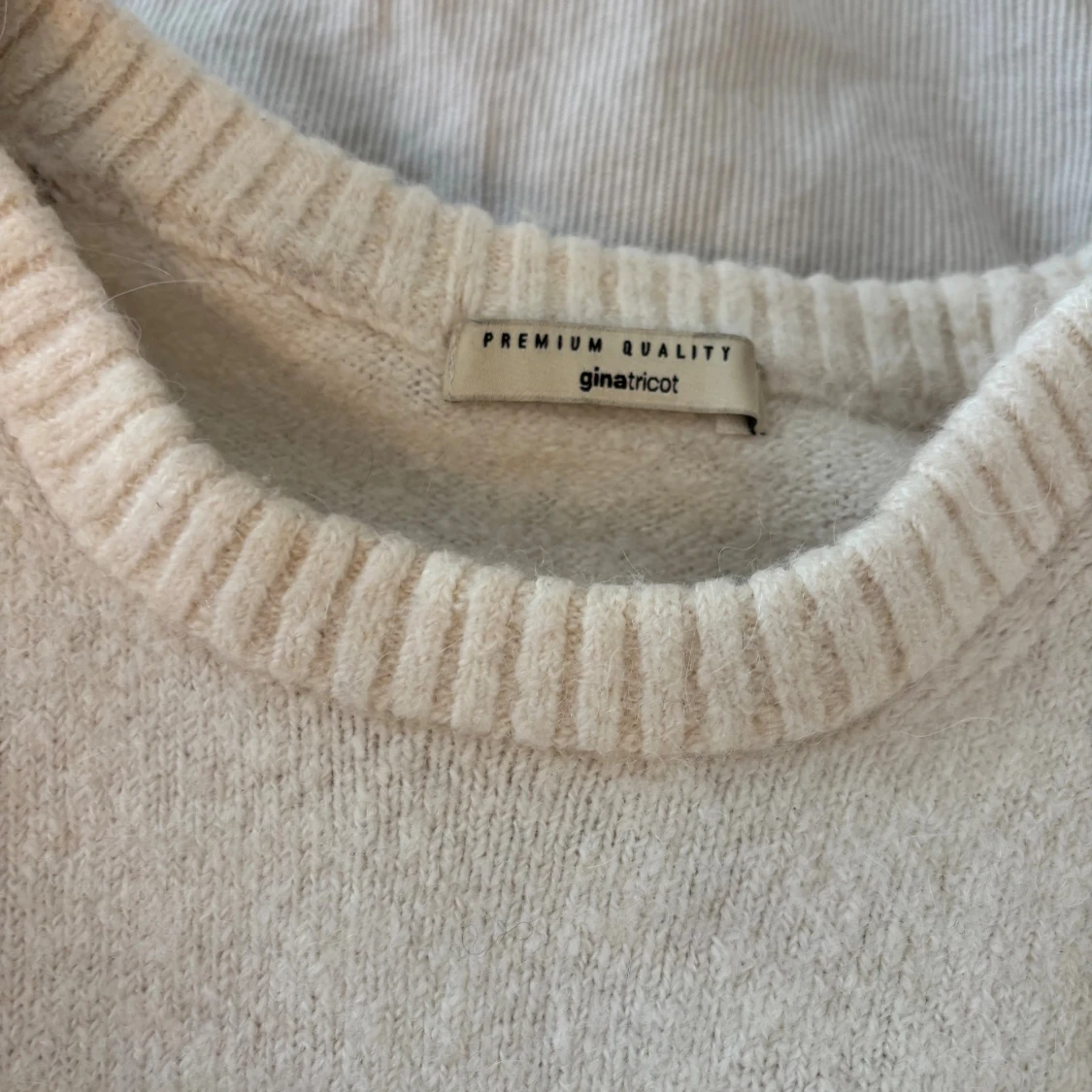 Mysig beige stickad tröja från Gina Tricot med rund halsringning och ribbade muddar. Perfekt för lager-på-lager och chill höst- eller vinterstil. Enkel och stilren design som passar till allt.