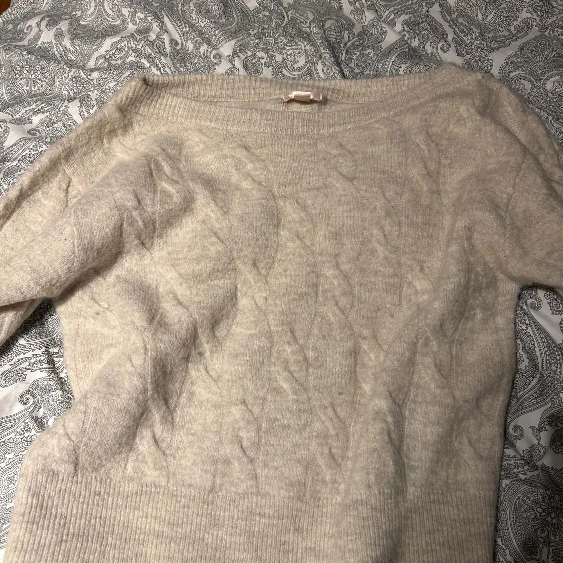 Mysig beige stickad tröja från Gina Tricot i storlek S. Tröjan har ett klassiskt kabelstickat mönster, rund halsringning och långa ärmar med breda ribbade muddar. Perfekt för lager-på-lager under kyliga dagar. Aldrig använd‼️