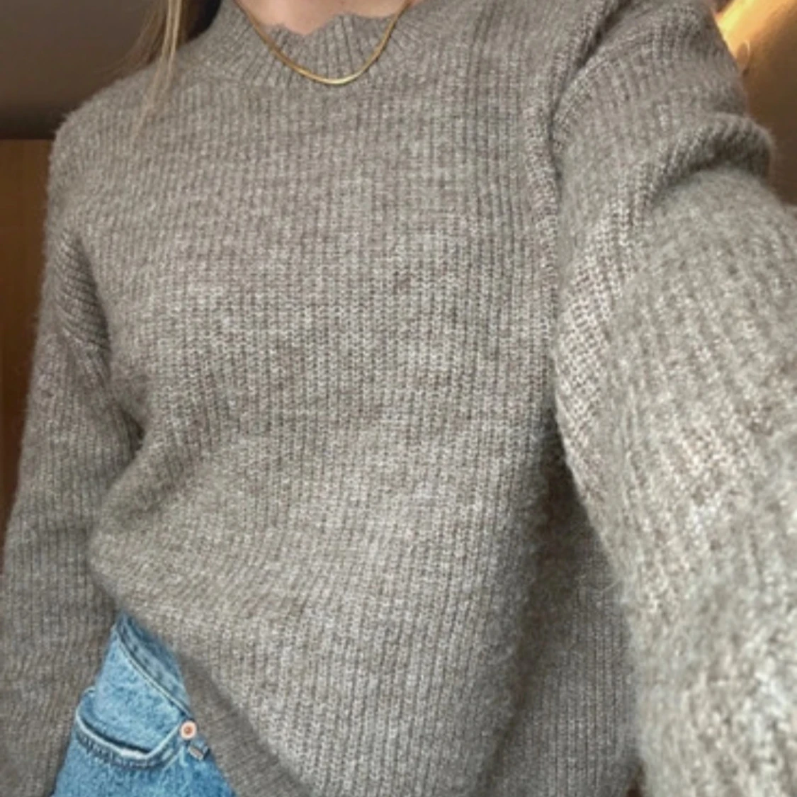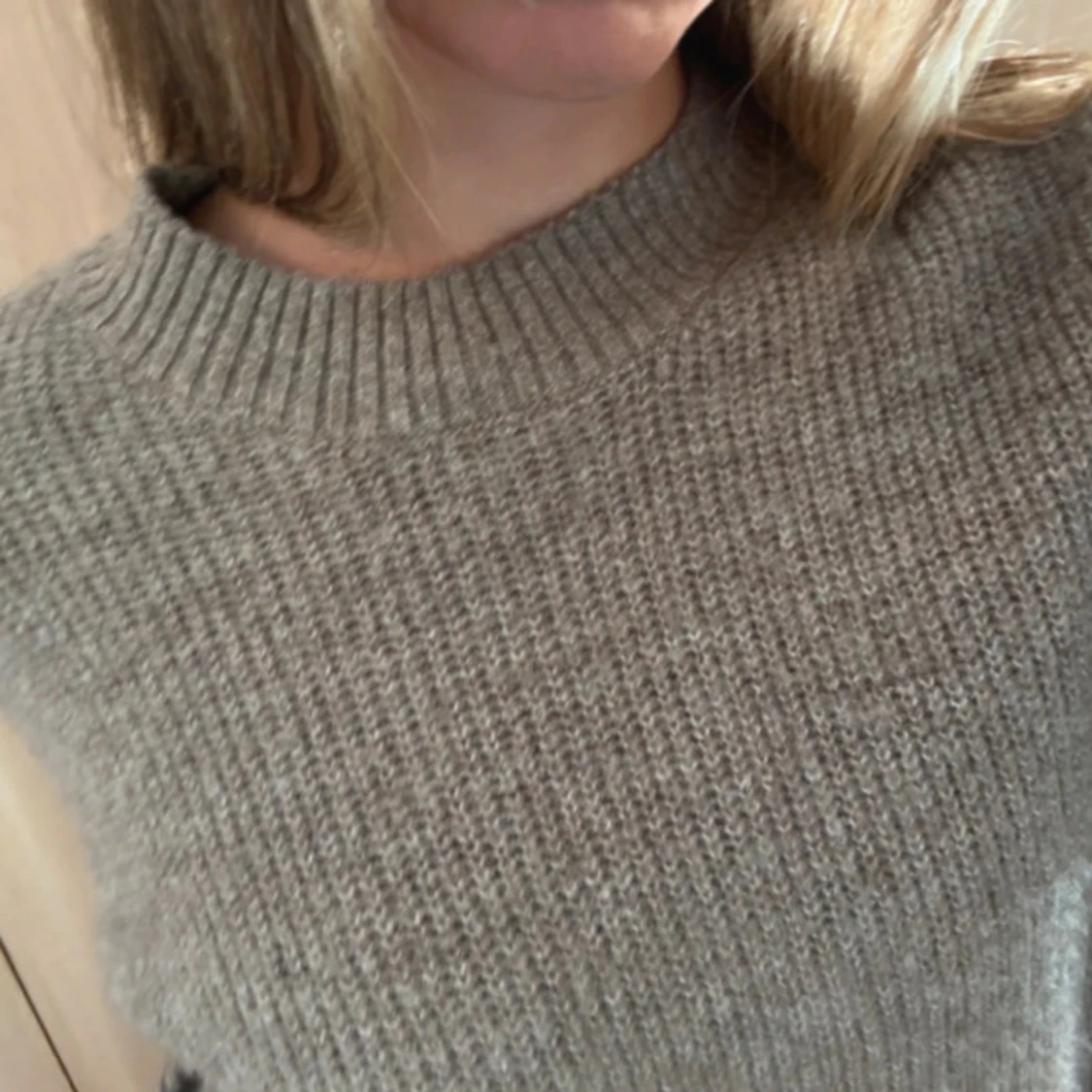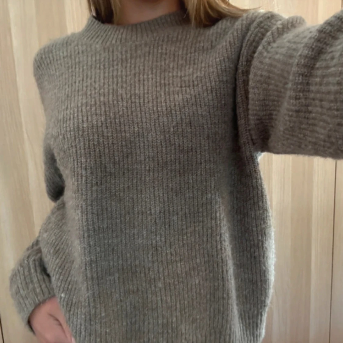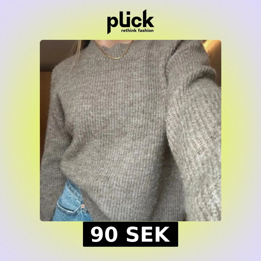 Mjuk och mysig stickad tröja i neutral brun- beige färg. Rund halsringning och ribbade muddar vid ärmslut och nederkant. Perfekt för vardags eller lager-på-lager under kalla dagar. Normal passform. Storlek: M Skick: Mycket bra skick / knappt använd
