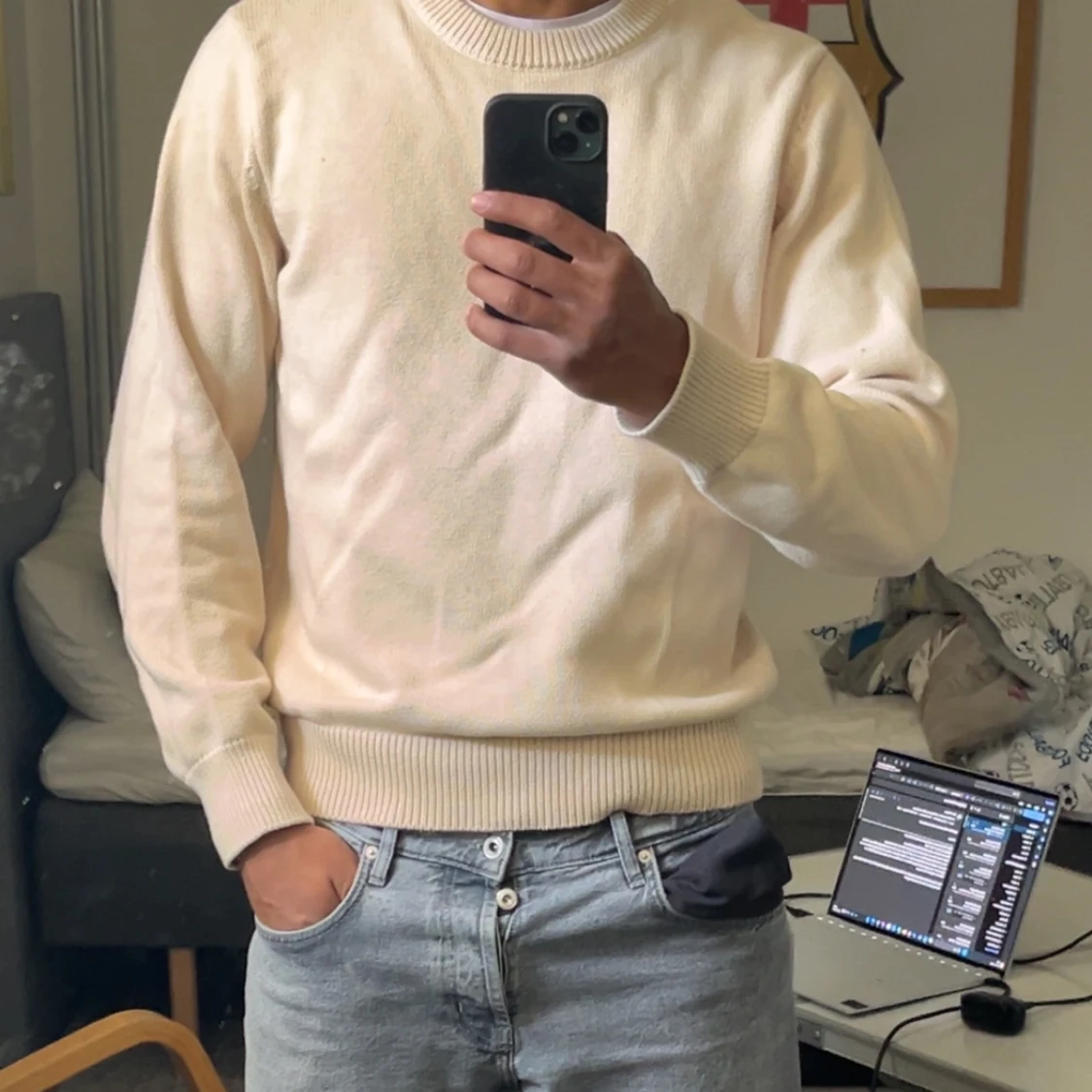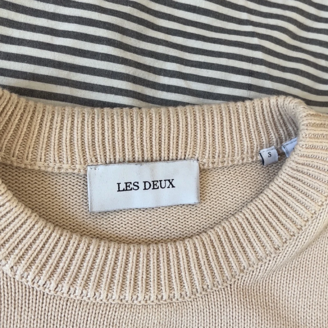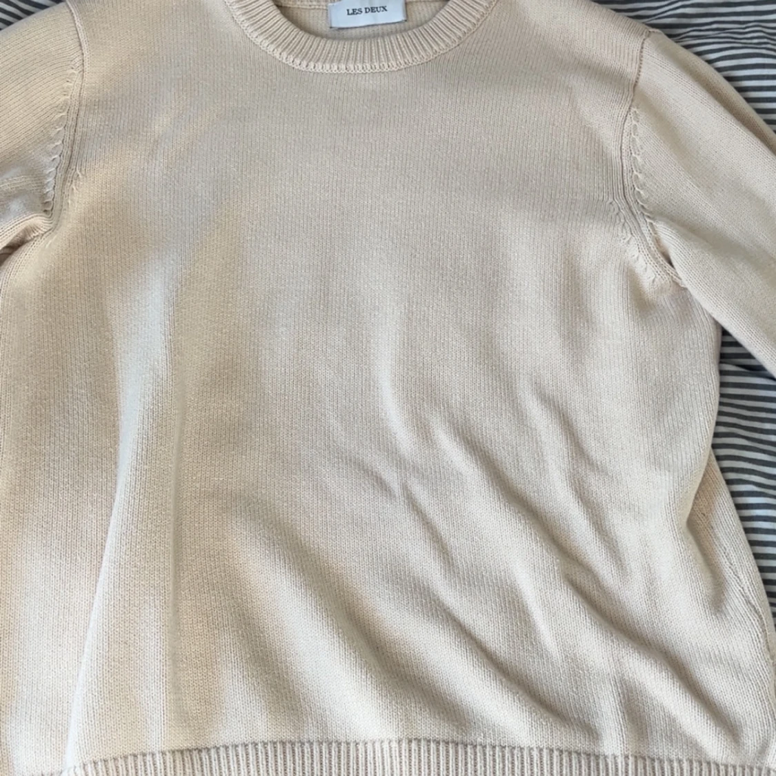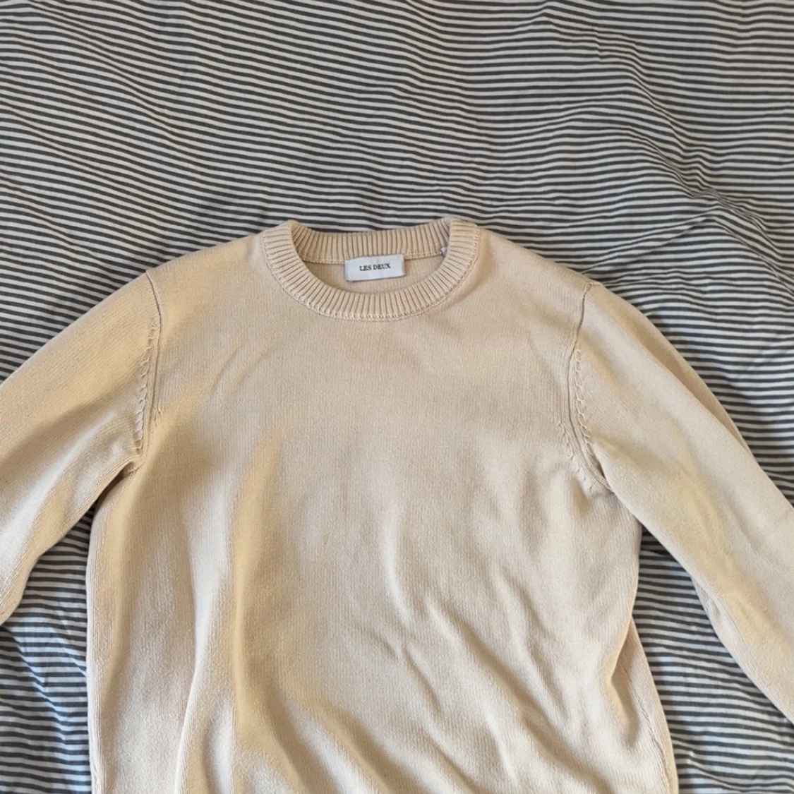 Säljer en stilren beige stickad tröja från Les Deux. Tröjan har rund halsringning och långa ärmar, perfekt för lager-på-lager eller som den är. Enkel och klassisk design som passar till mycket.[Använd max 10gånger] Stor för S