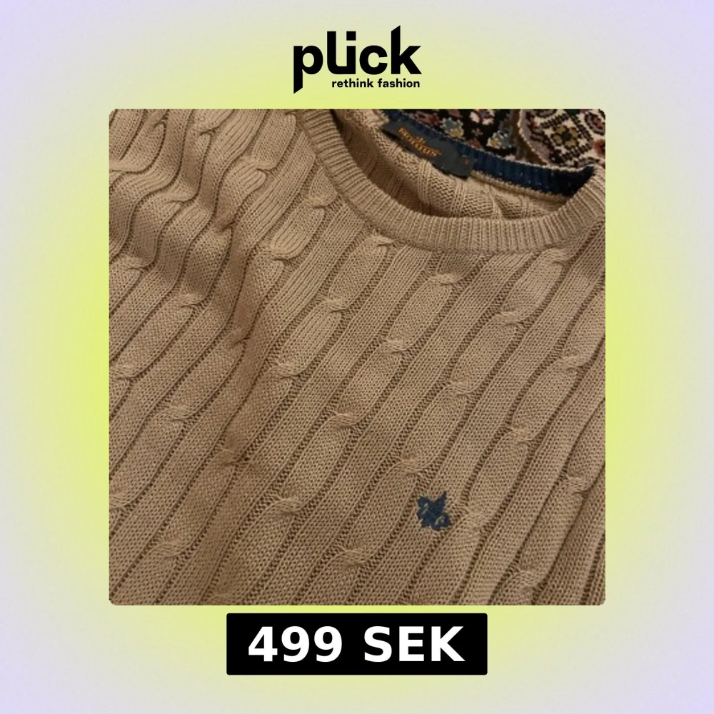 Säljer en beige kabelstickad tröja från Morris med rund halsringning och diskret logga broderad på bröstet. Tröjan har lång ärm och är gjord i mjuk bomull, perfekt för lager-på-lager under höst och vinter.