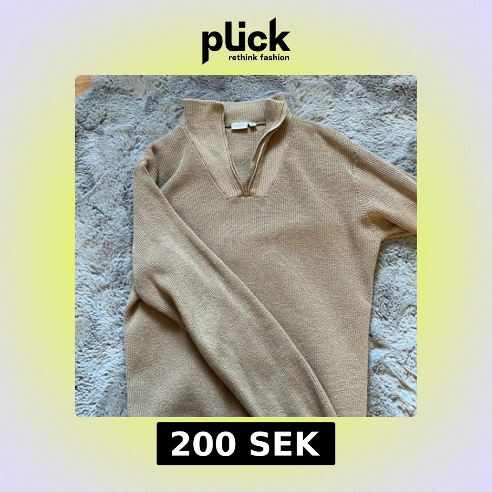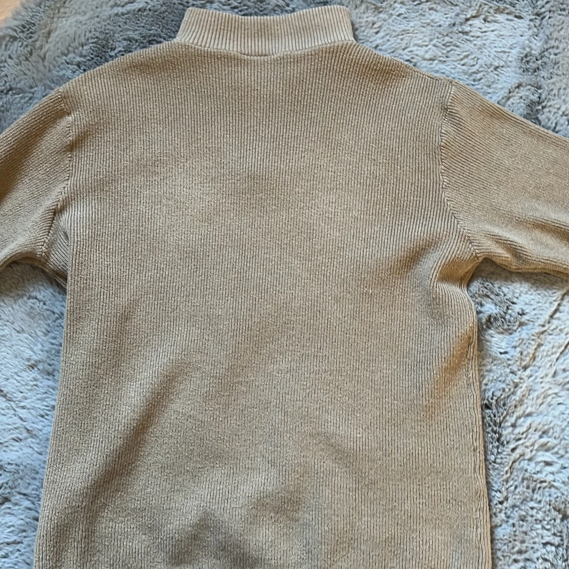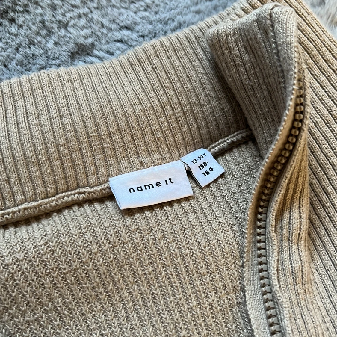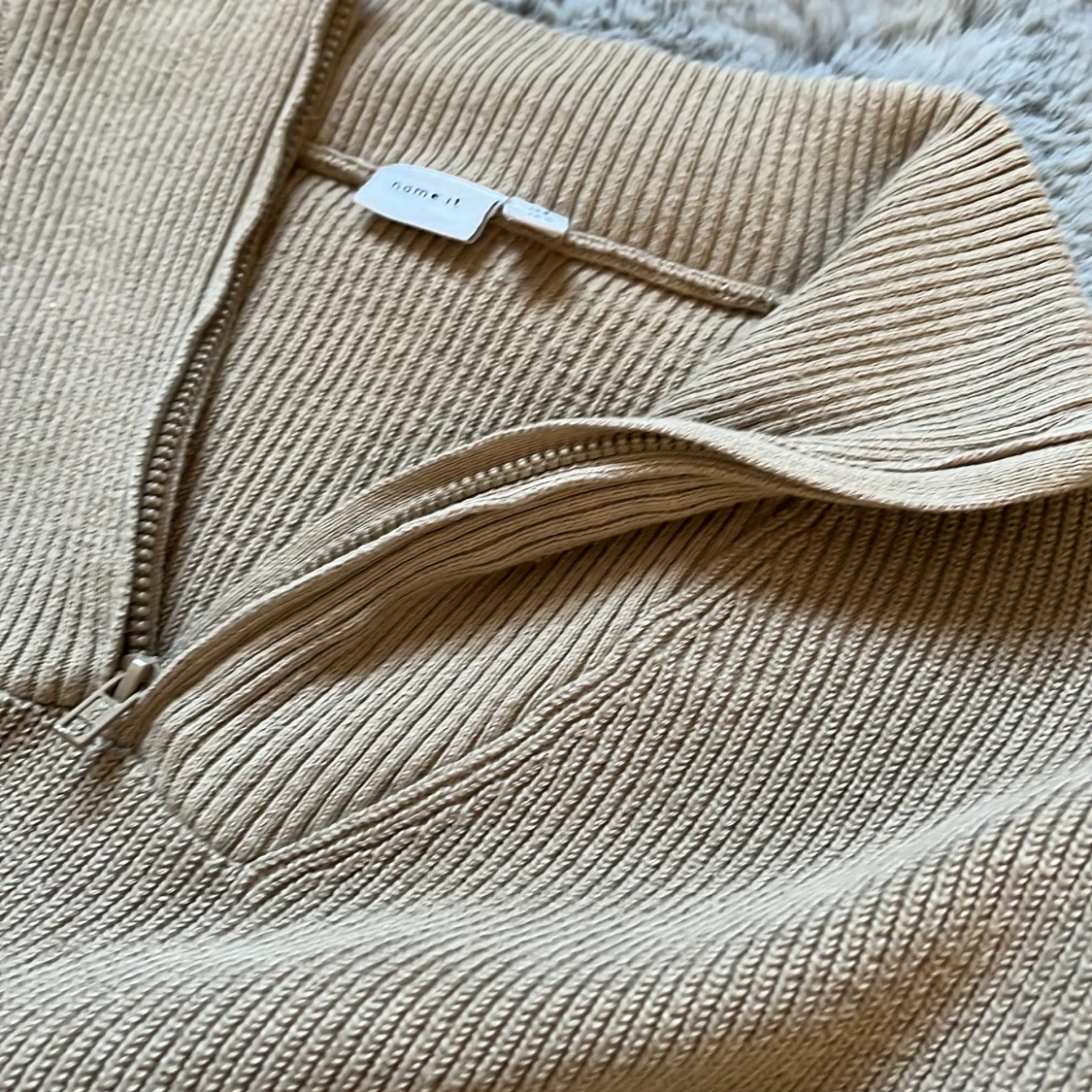 Säljer en stilren beige stickad tröja från Name It. Tröjan har en dragkedja vid halsen och långa ärmar, perfekt för kyligare dagar. Den har en klassisk design som passar till många tillfällen.