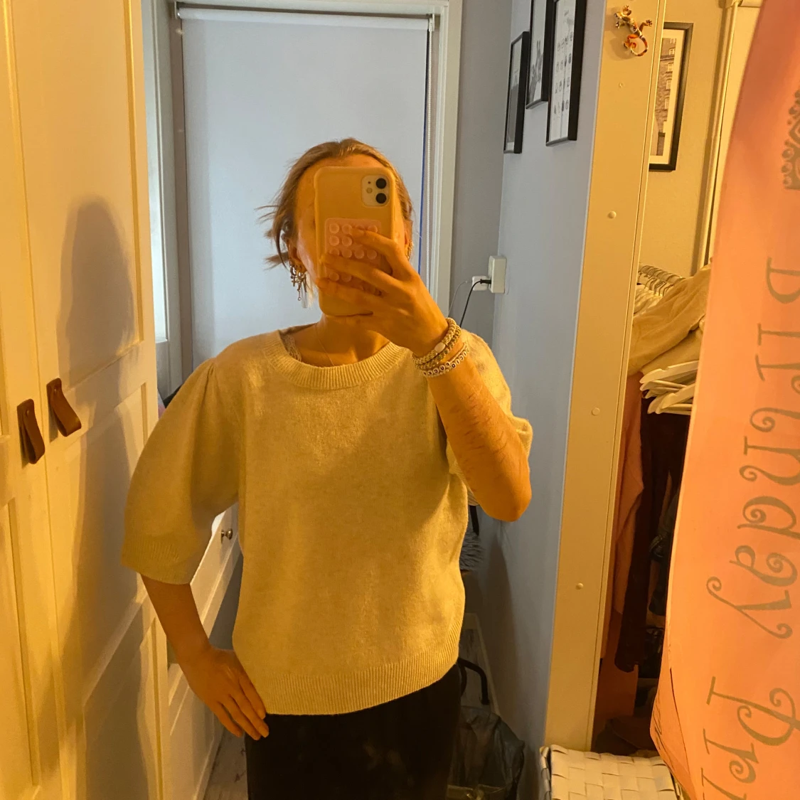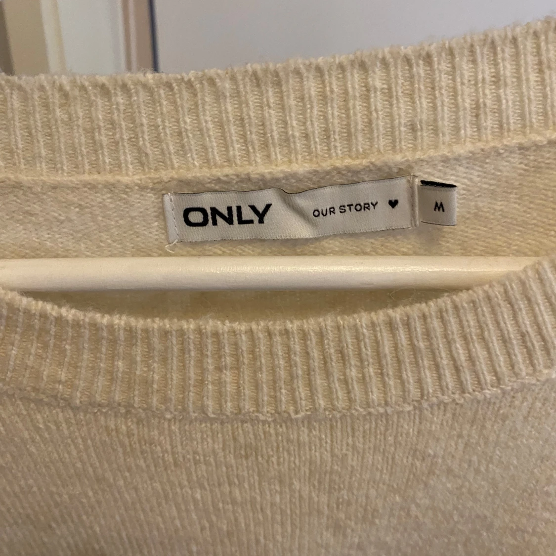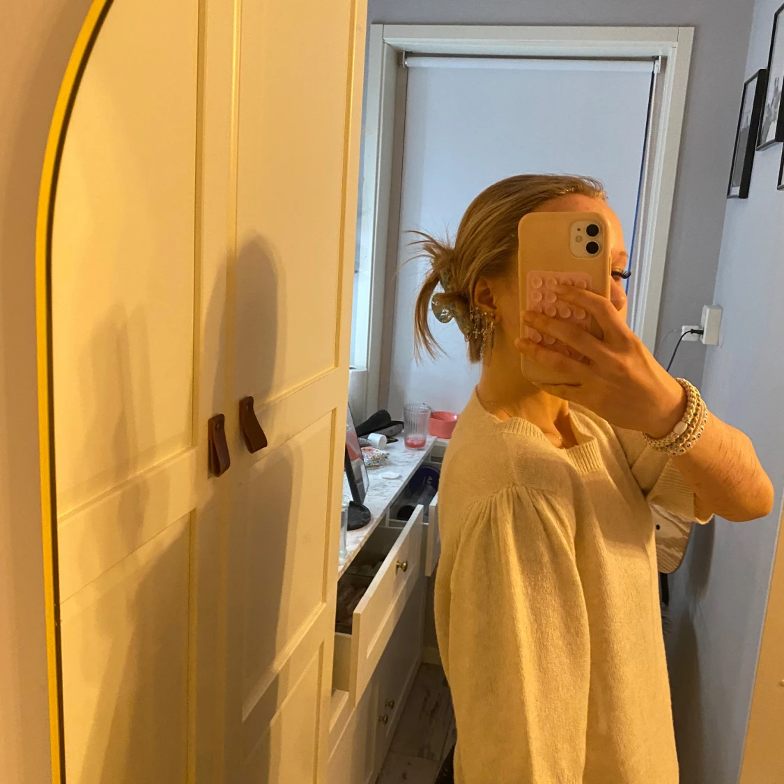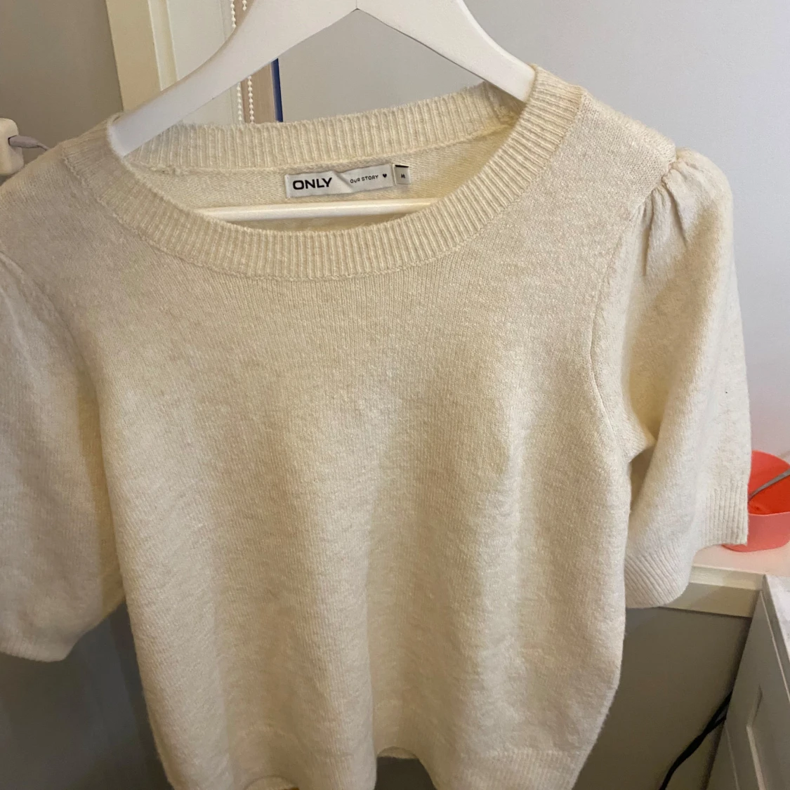 Säljer en beige stickad tröja från ONLY med korta puffärmar och rund halsringning. Aldrig använd