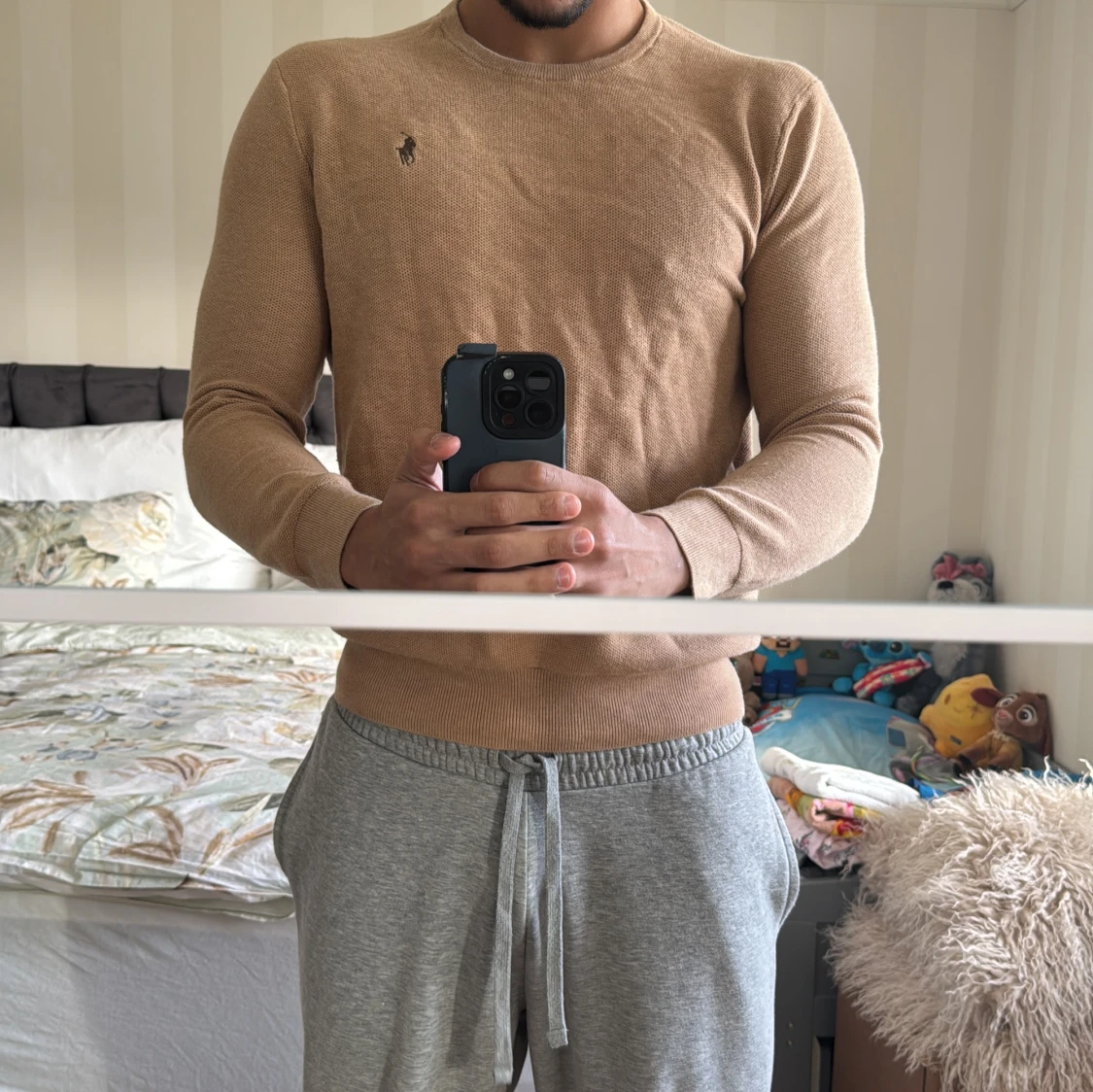 Snygg beige stickad tröja från Polo Ralph Lauren med den klassiska broderade loggan på bröstet. Tröjan har rund hals och långa ärmar, perfekt för dig som gillar stilren och enkel design. Passar dig som vill ha en clean look. Passar S med
