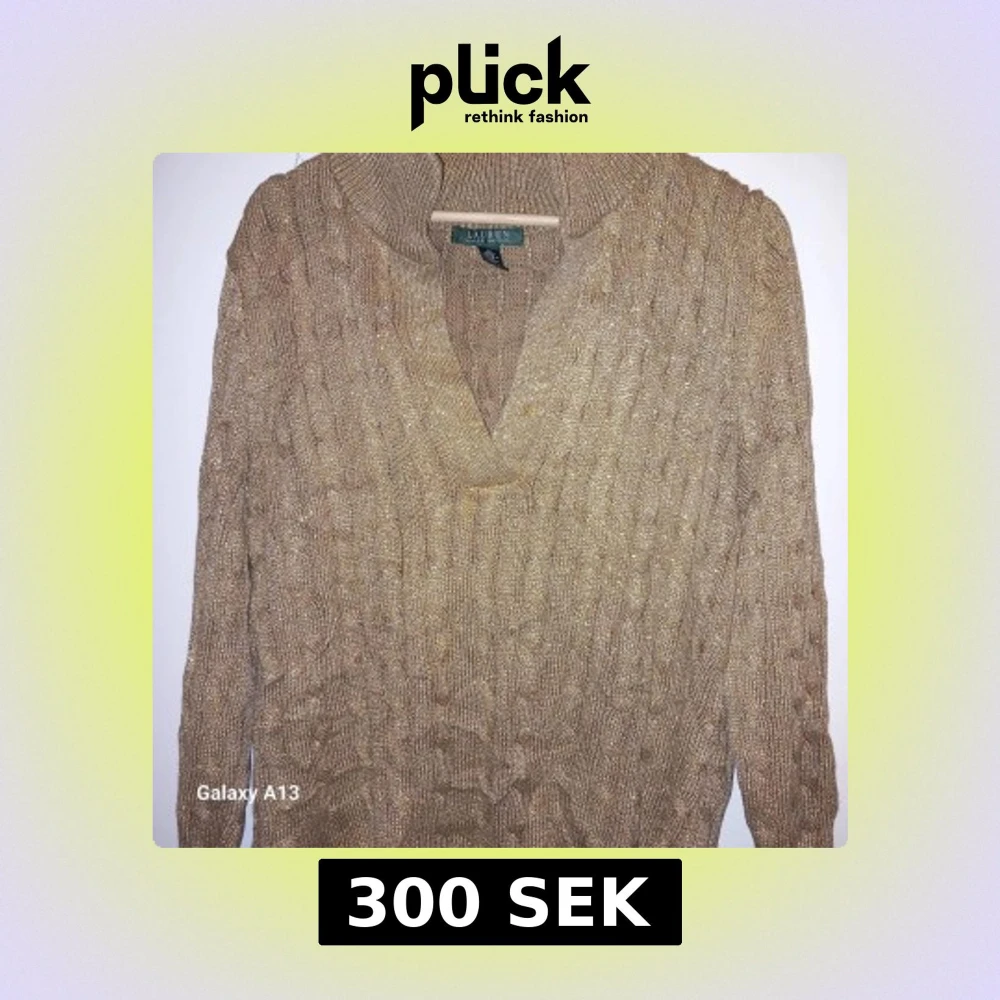 Säljer en snygg beige stickad tröja från Ralph Lauren med ett subtilt glittrigt inslag. Tröjan har en v-ringad design och långa ärmar, perfekt för kyligare dagar. Den är tillverkad i en blandning av bomull och polyester med metalliska detaljer.