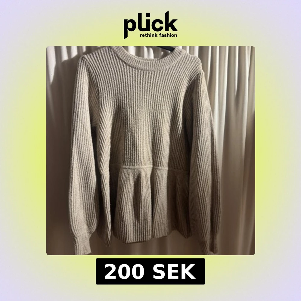 Mysig beige stickad tröja från SAMSA Collection med ribbad struktur och rund hals. Den har en volang längst ne, sparsamt använd och super skön