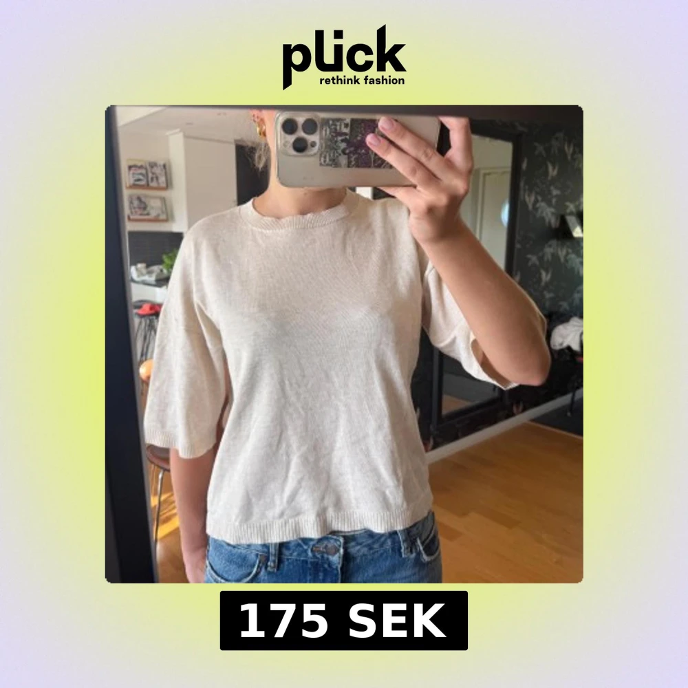 Säljer en beige stickad tröja från Soft Rebels med rund hals och korta ärmar. Tröjan har en enkel och clean look med ribbade detaljer vid hals och nederkant. Perfekt för dig som gillar stilrena och mjuka plagg.