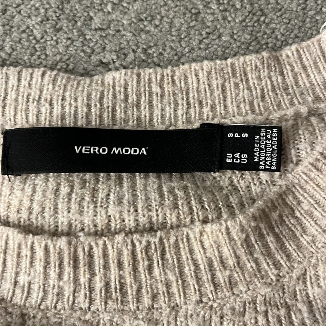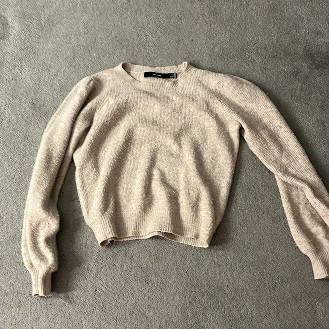 Mysig beige stickad tröja från Vero Moda. Perfekt för kyliga dagar med sin mjuka och bekväma passform. Tröjan har långa ärmar och ribbade kanter som ger en stilren look. Den är använd mycket så därför är den lite nopprig men annars så fin.