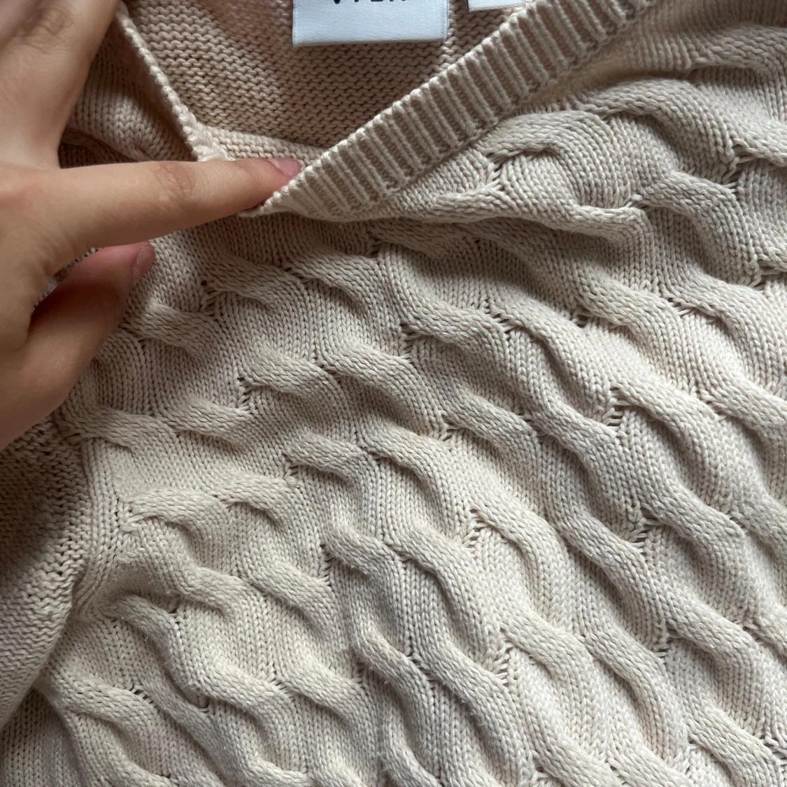 Säljer en snygg beige stickad tröja från Vero Moda med ett flätat mönster. Tröjan har korta ärmar och en rund halsringning. Perfekt för en stilren look. Hör av dig vid intresse! 😊