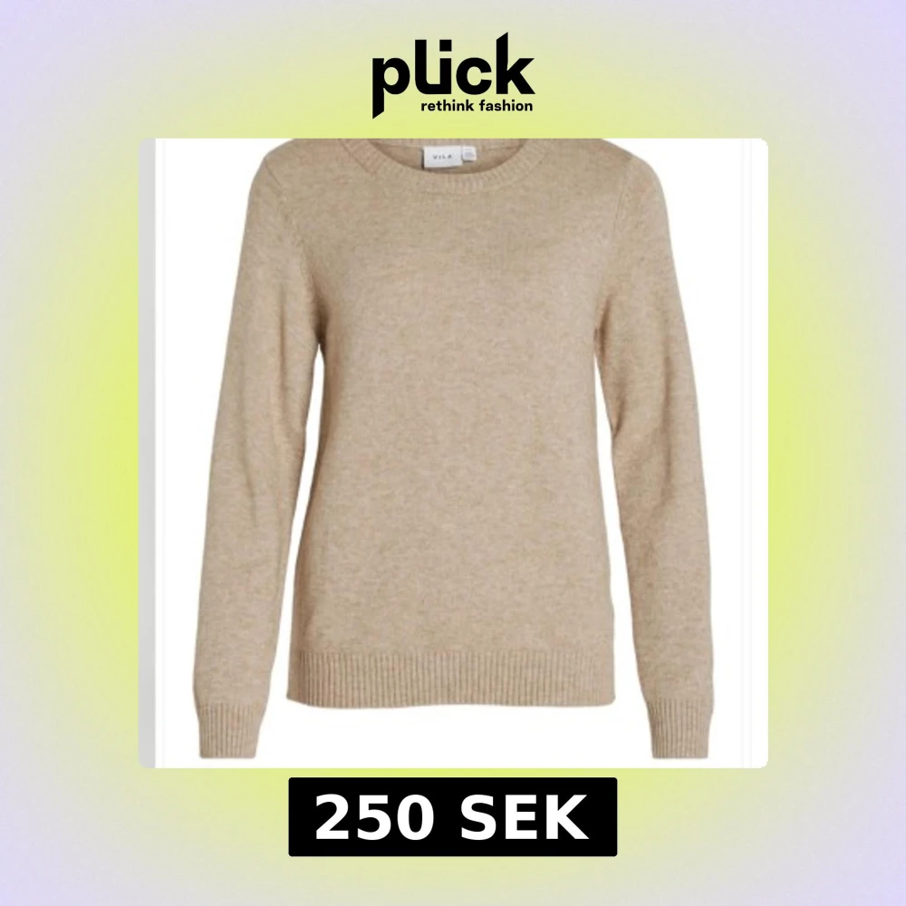 Säljer en stilren beige stickad tröja från Vila. Tröjan har en rund halsringning och långa ärmar. I strlk xs . Prislappen finns kvar