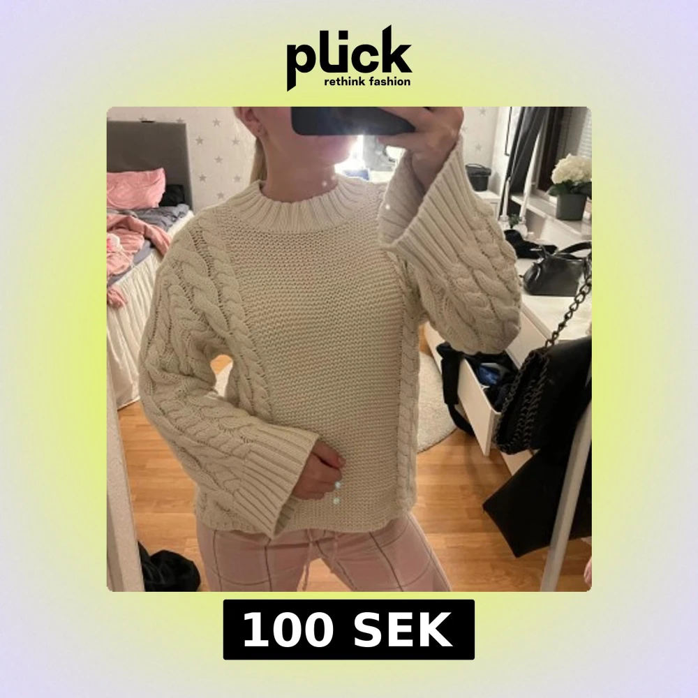 Mysig beige stickad tröja med breda ärmar och snyggt flätmönster längs sidorna och ärmarna. Tröjan har en grovstickad struktur och en hög ribbad krage.