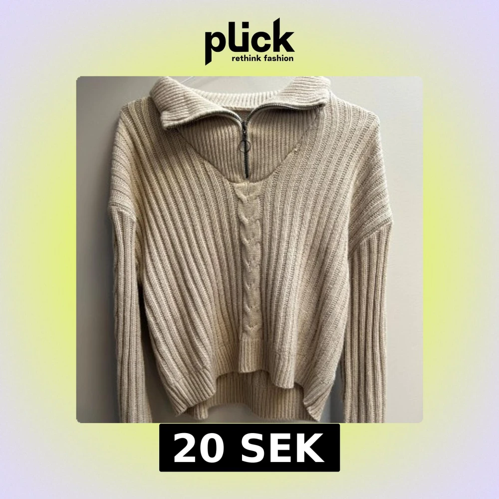 Beige stickad tröja med ribbat mönster och snygg kabelstickad detalj framtill. Tröjan har en hög krage med half zip och långa ärmar. Perfekt för lager på lager och chill stil under höst och vinter.
