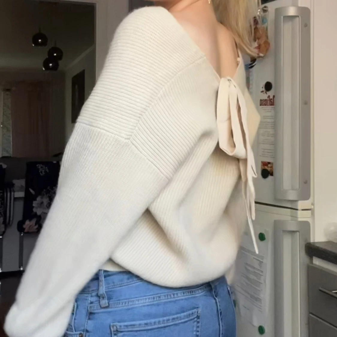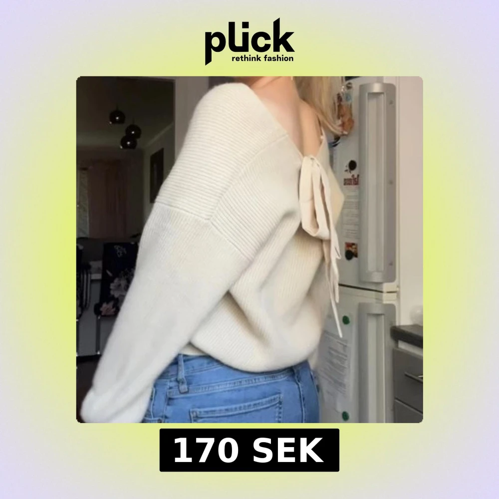 Säljer en mysig beige stickad tröja med v-ringning och knyt i ryggen. Tröjan har långa ärmar och en lös passform.