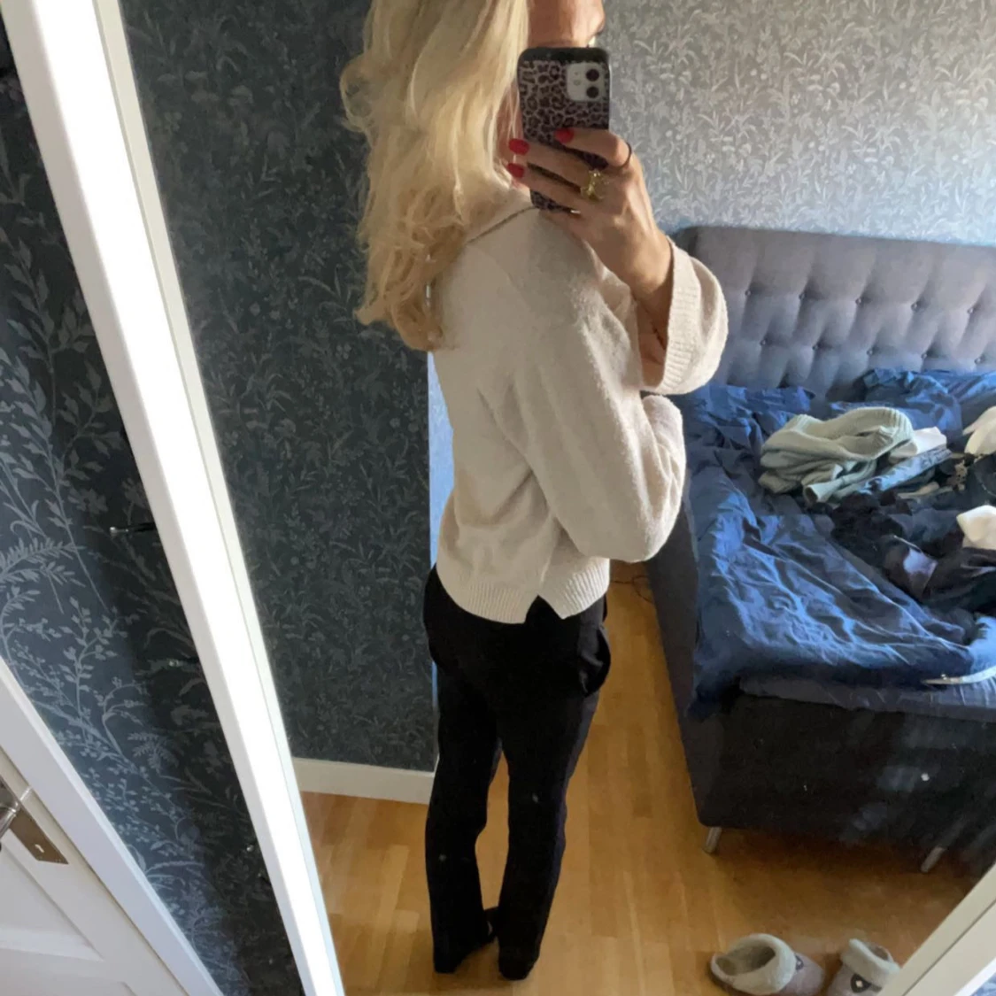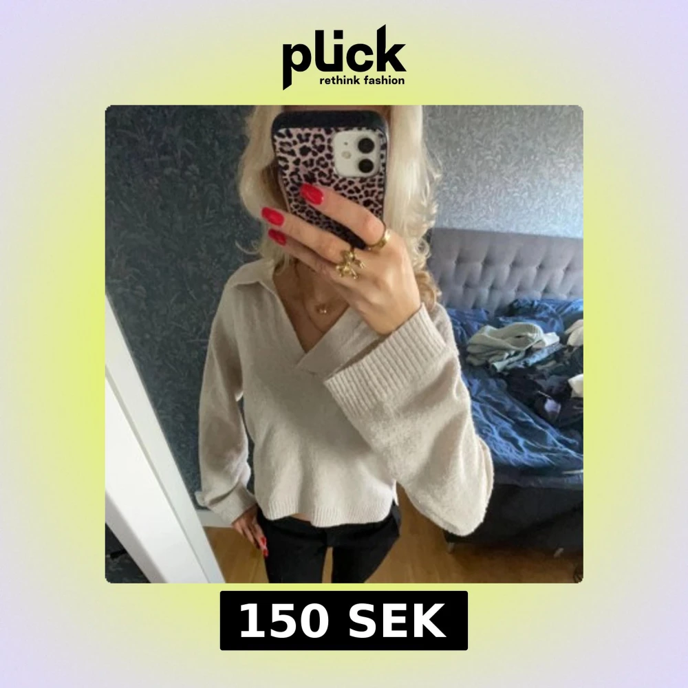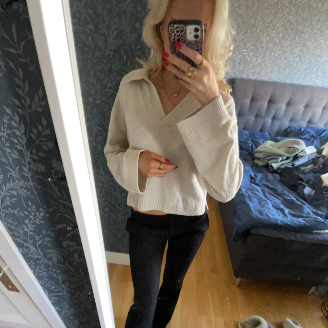 Säljer en stilren beige stickad tröja med krage och långa ärmar. Tröjan har en avslappnad passform och ribbade muddar vid ärmslut. Perfekt för en mysig och trendig look. Lite nopprig men inget man tänker på.