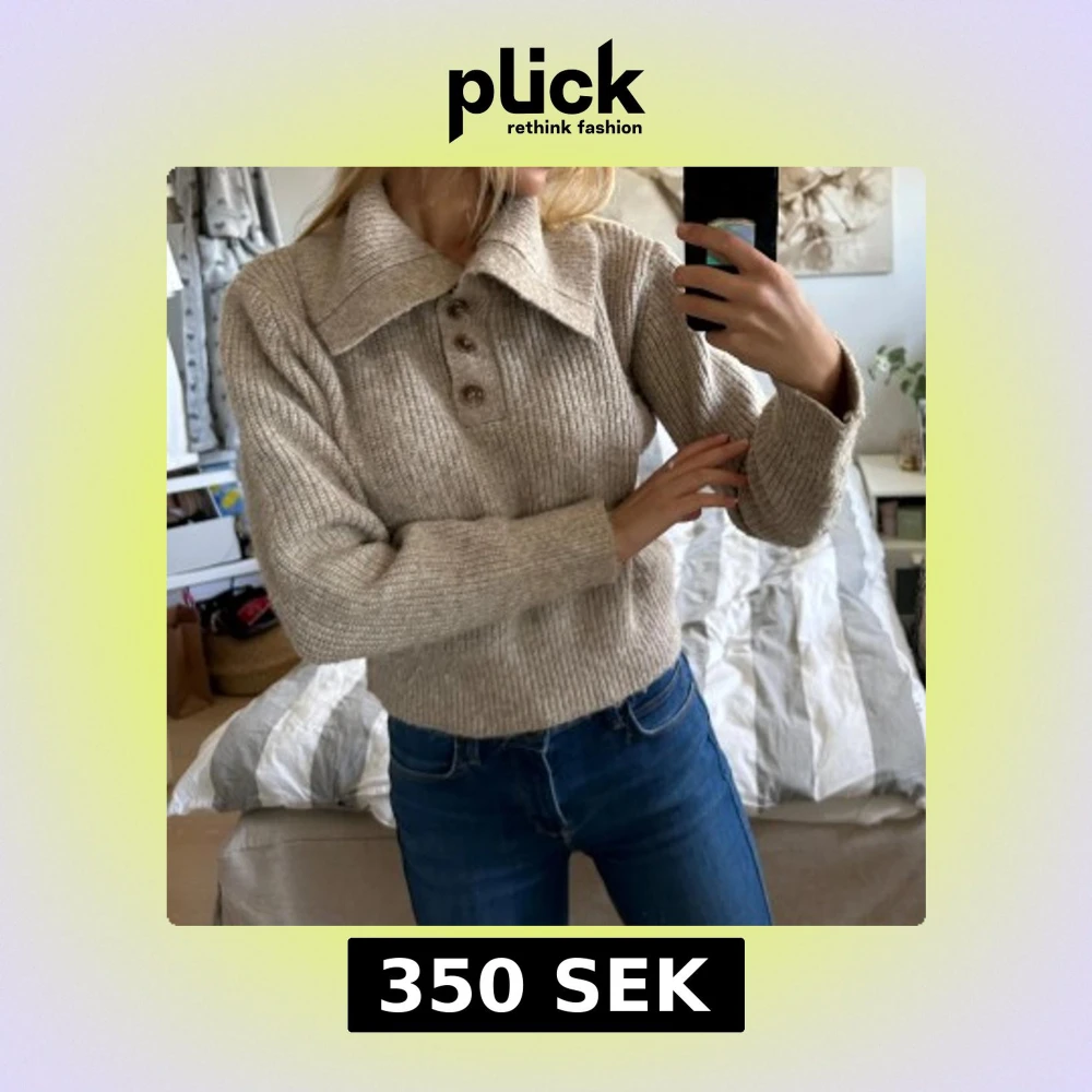 Säljer en stilren beige stickad tröja med krage och knappar framtill. Super mysig! 🌷