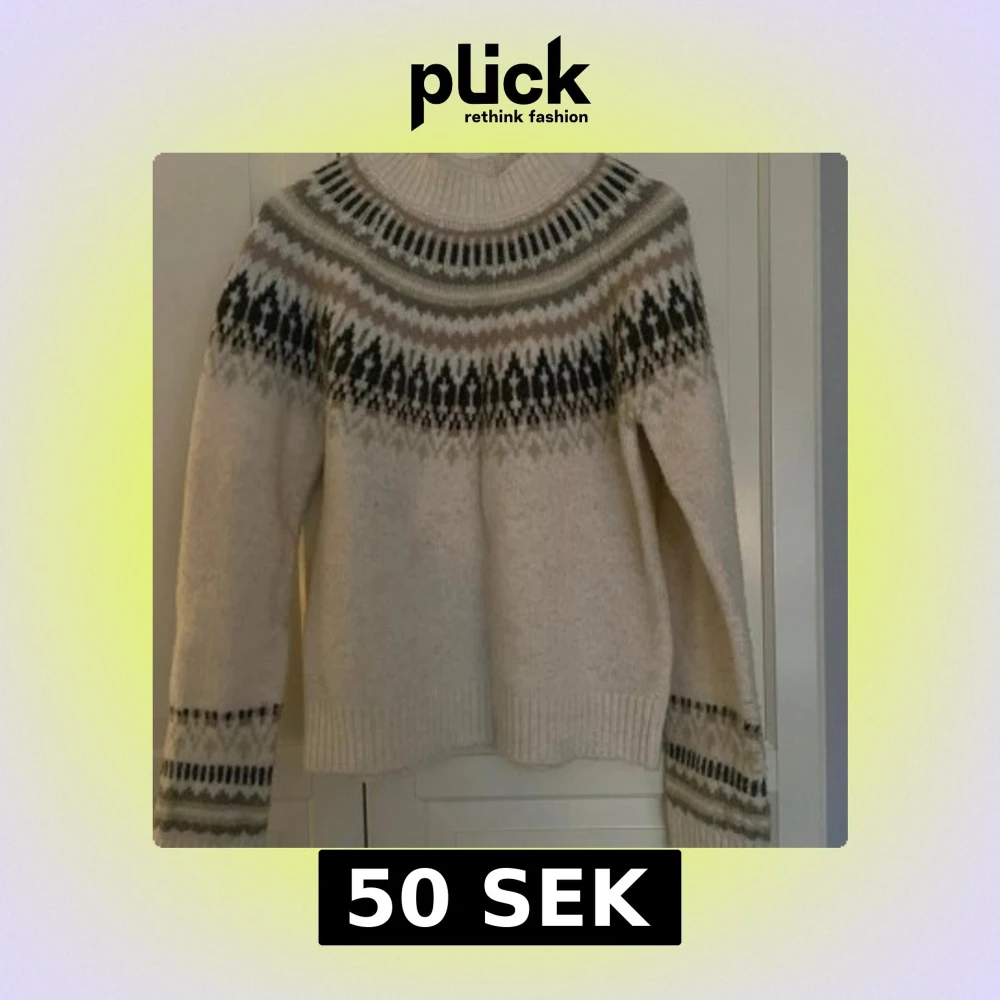 Storlek XS/34. Mysig beige stickad tröja med ett klassiskt mönster i svart och grått runt halsen och ärmsluten. Perfekt för kyliga dagar.