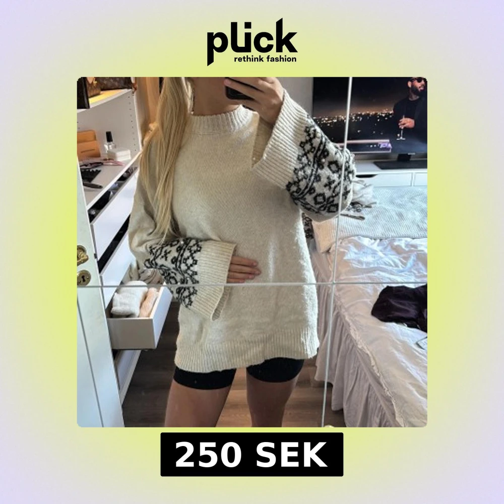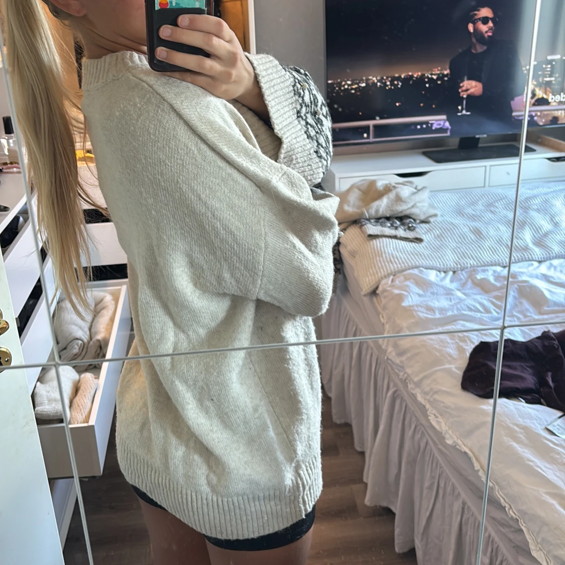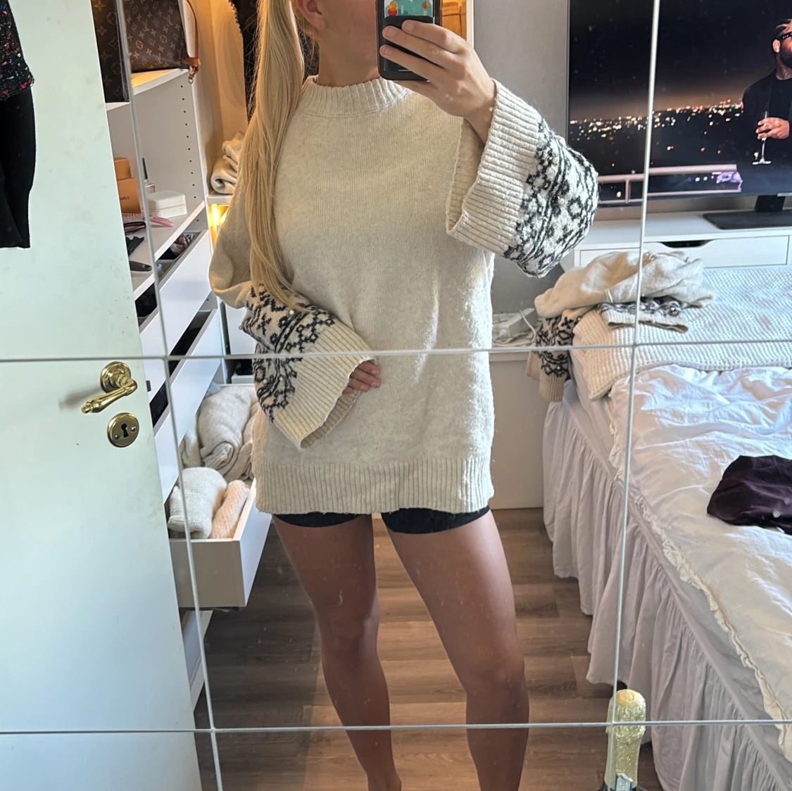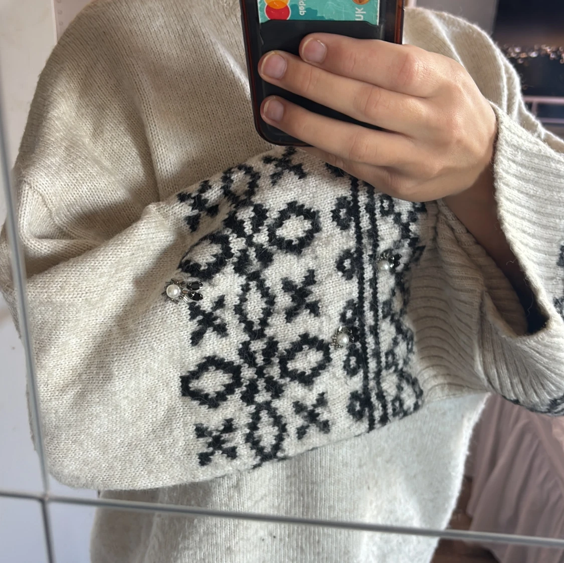 Säljer en oversized beige stickad tröja med breda långärmade muddar som har svart mönster och pärldetaljer. Tröjan har ribbad hals och nederkant, och är perfekt för dig som gillar mysiga och unika plagg med lite extra detaljer på ärmarna.