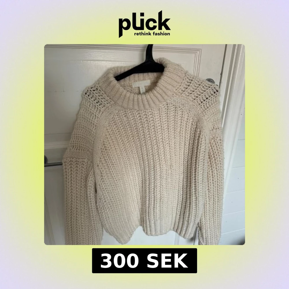 Säljer en chunky beige stickad tröja från H&M med bred polokrage och grov ribbstickning. Tröjan har lång ärm och en oversized, mysig passform som är perfekt för kyliga dagar.
