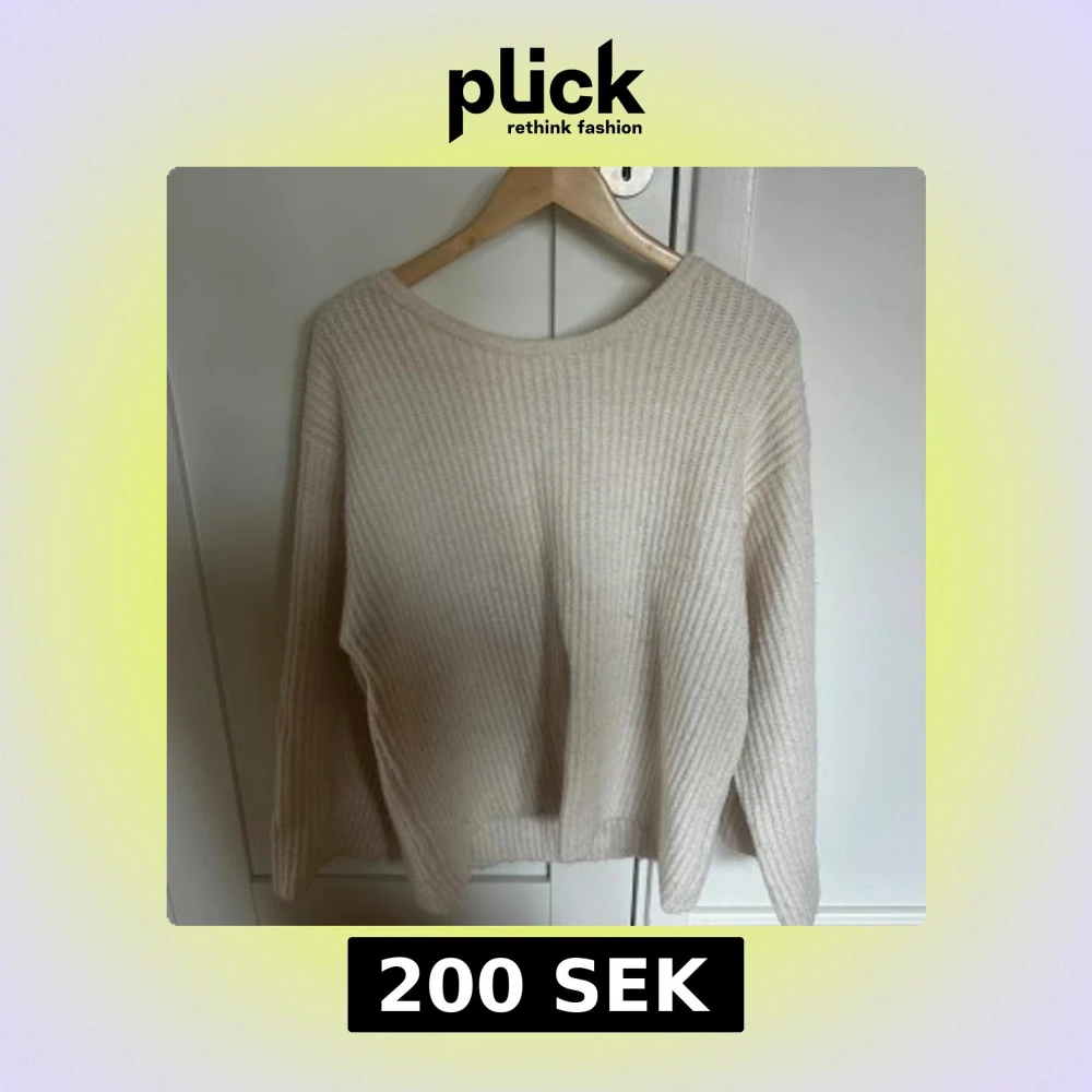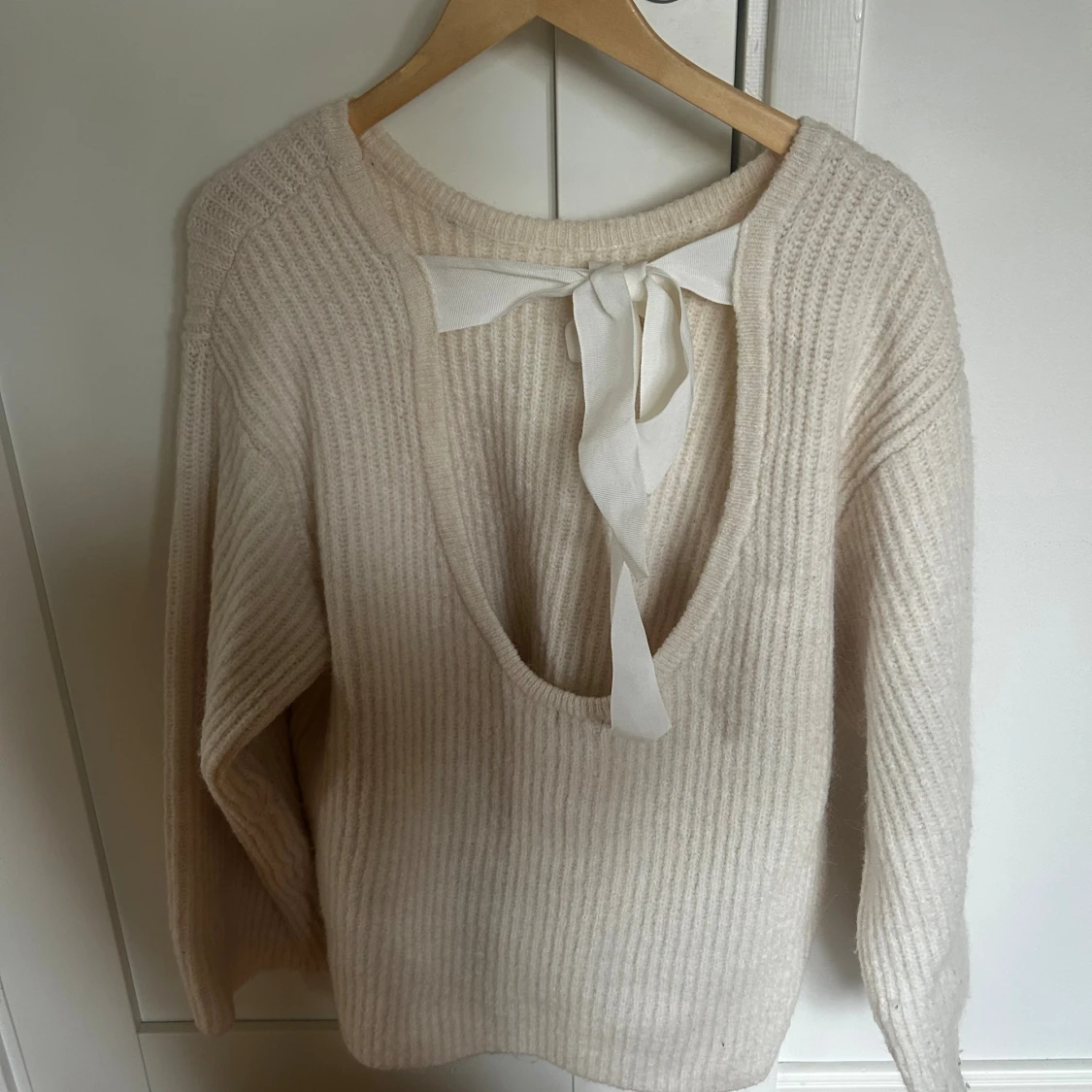 Superfin beige stickad tröja med ribbad struktur och öppen rygg som knyts med en bred rosett.