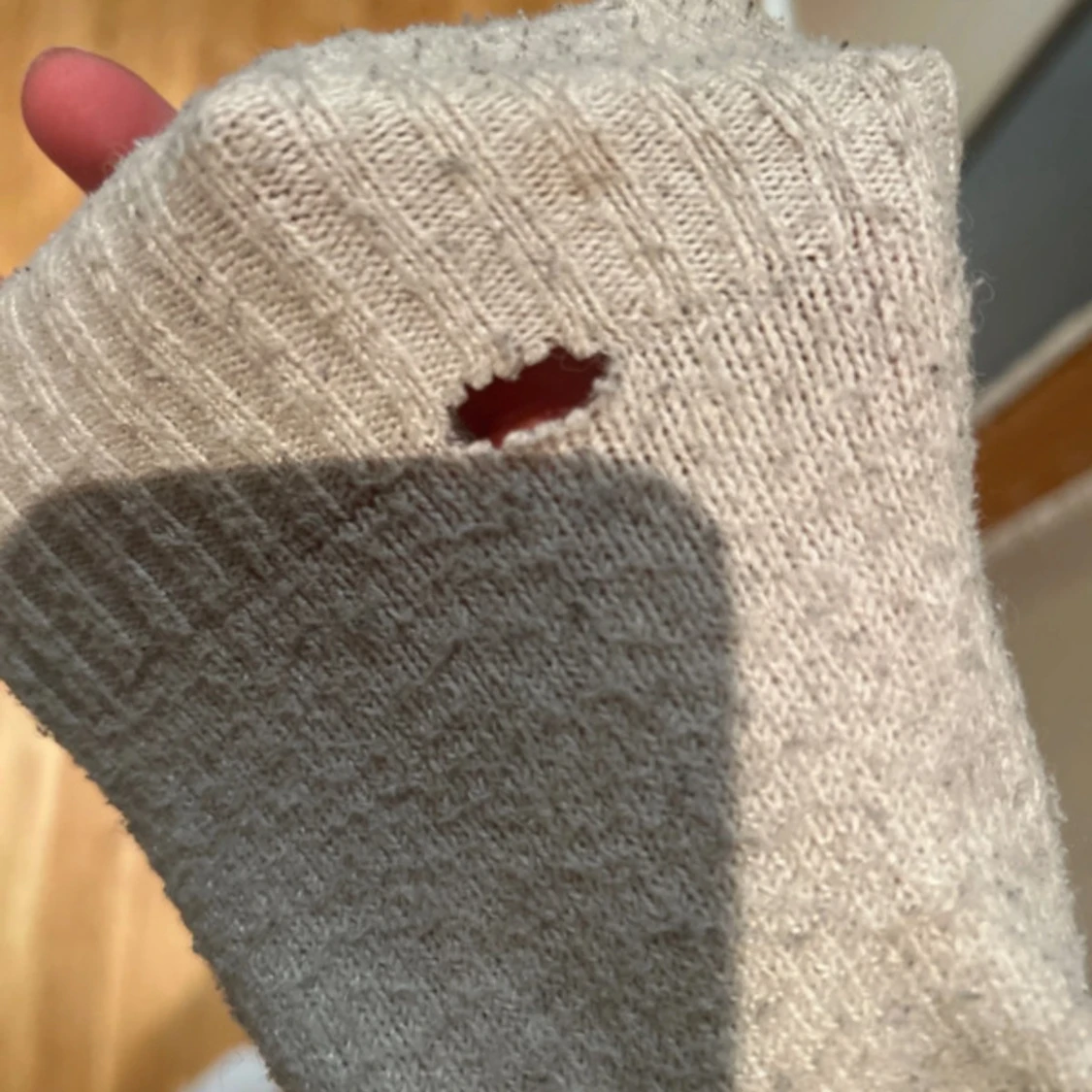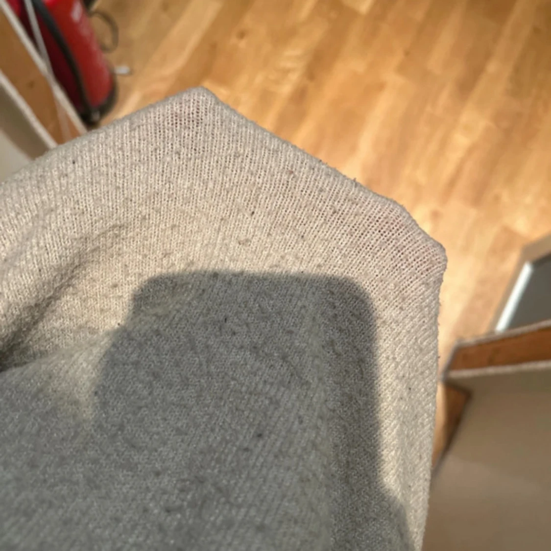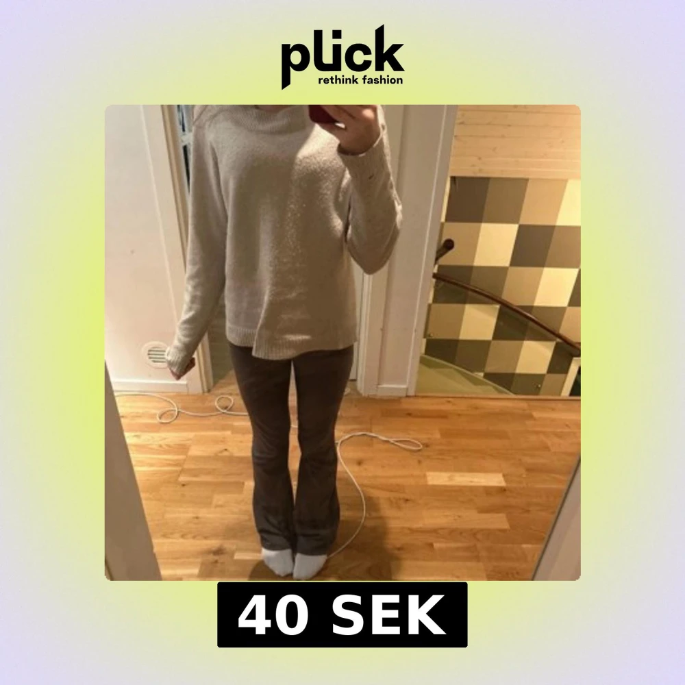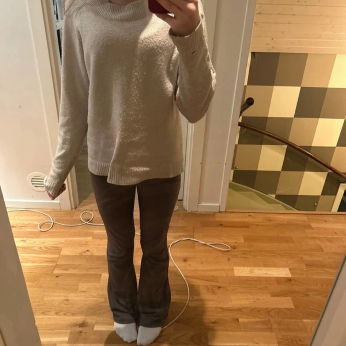 Mysig beige stickad tröja med rund hals och långa ärmar. Tröjan har ribbade muddar vid ärmslut och nederkant. Perfekt för lager-på-lager under kyliga dagar. Har ett hål på ena armen se bild 3