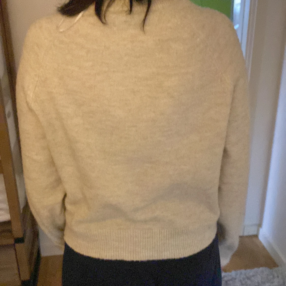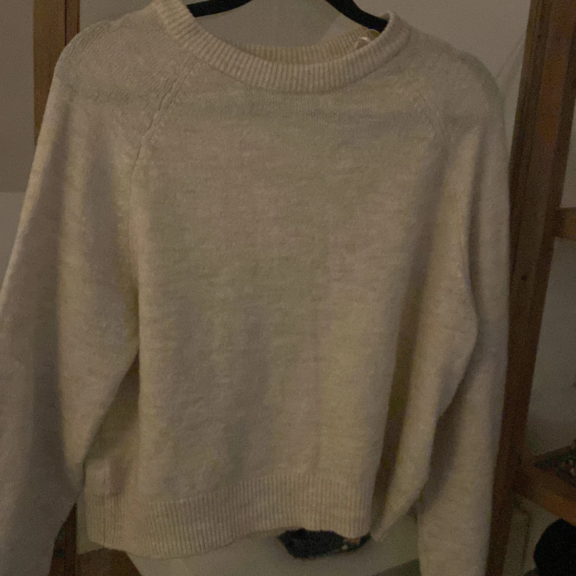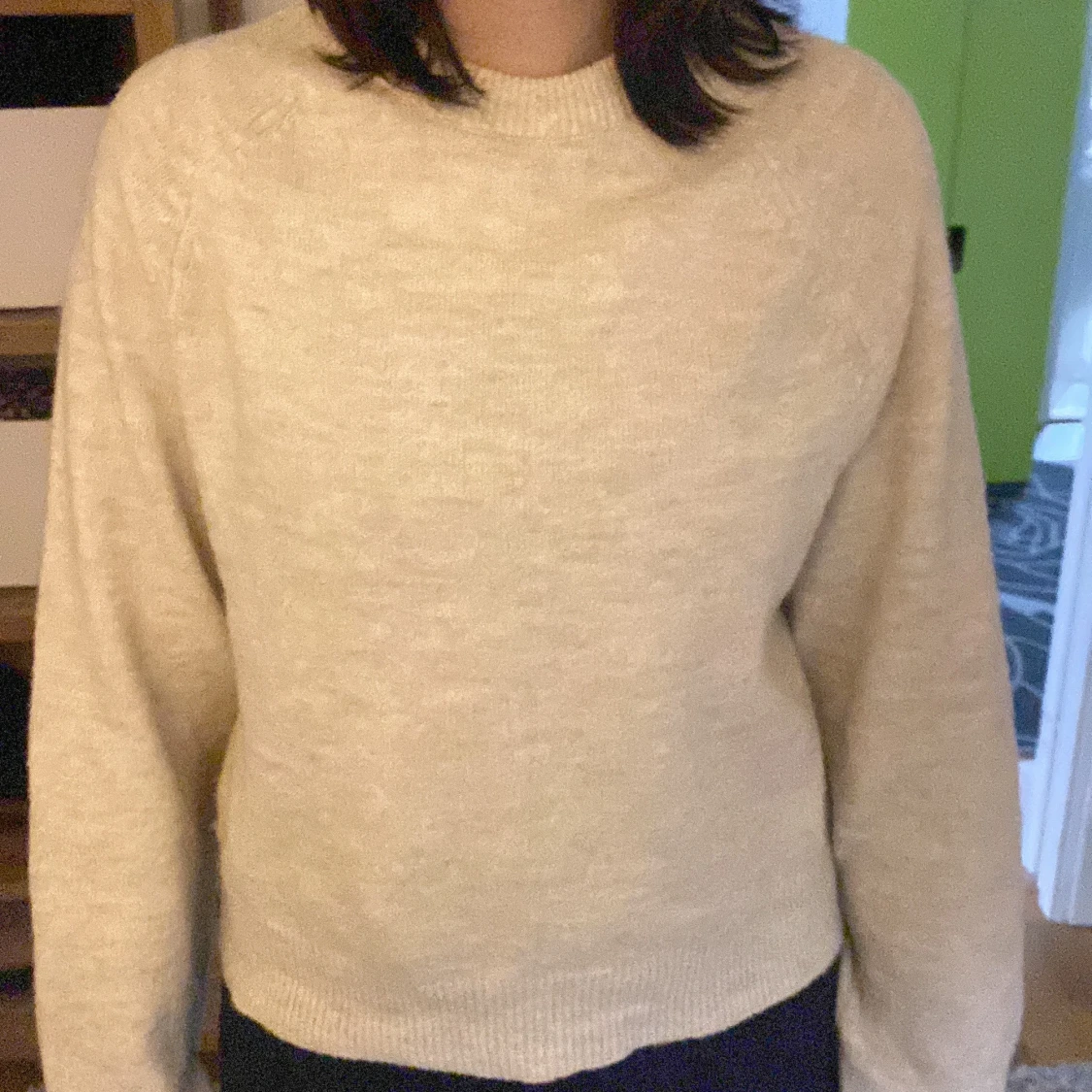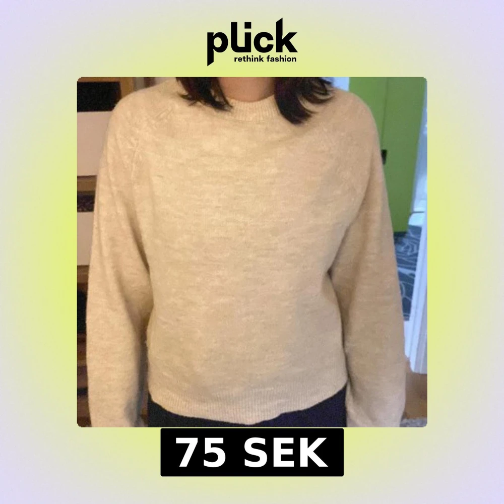 Enkel och snygg beige stickad tröja med rund halsringning och långa ärmar. Tröjan har ribbade muddar vid ärmslut och nederkant, vilket ger en clean och avslappnad look. Perfekt att slänga på sig när det är kyligt ute.