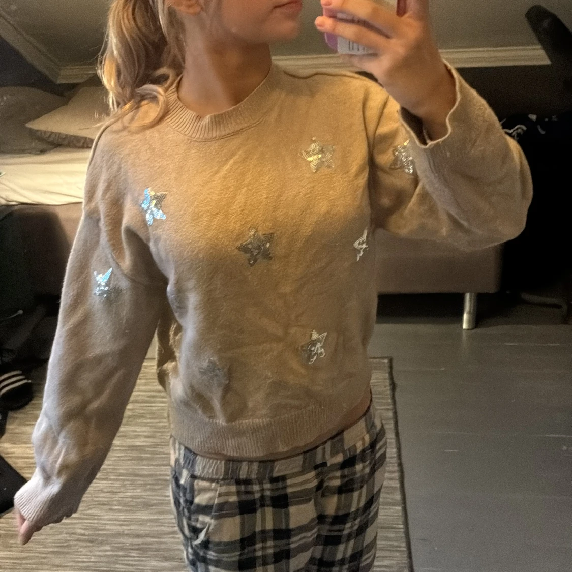 Supermysig beige stickad tröja med glittriga silverstjärnor på bröstet och ärmarna. Rund halsringning och långa ärmar. Perfekt för dig som gillar lite extra bling i vardagen!