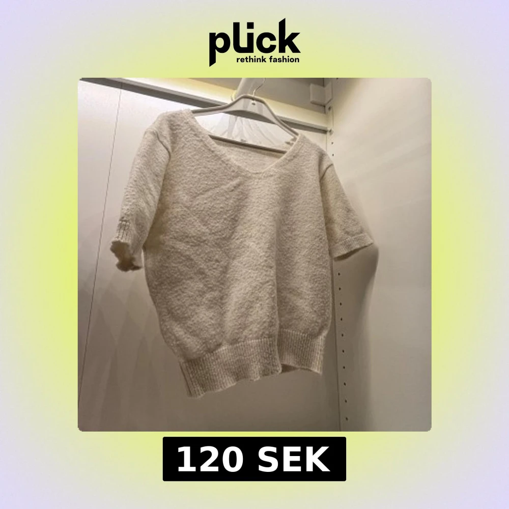 Mysig beige stickad tröja med v-ringning och korta ärmar. Perfekt för en avslappnad stil med ribbade kanter som ger en fin passform.