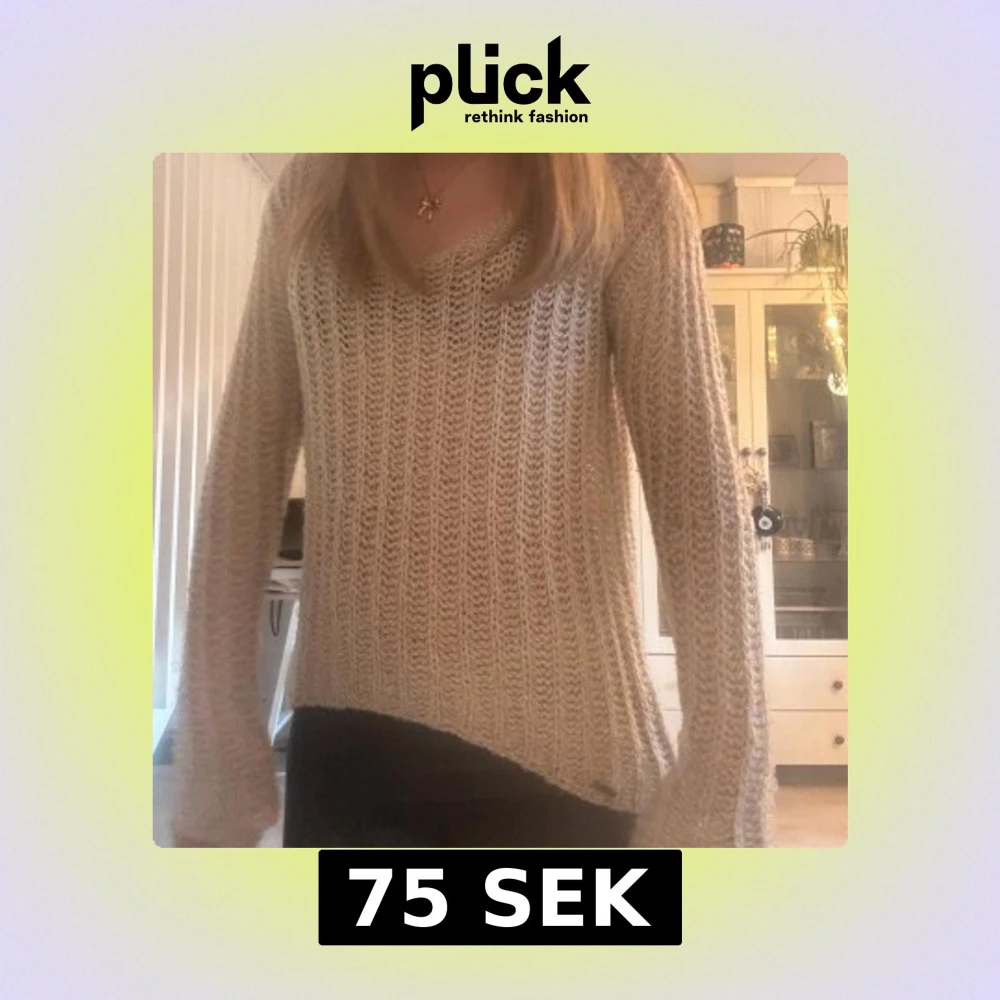 Säljer en beige stickad tröja med v-ringning och lång ärm. Tröjan har ett ribbat mönster och är mjuk och skön, perfekt för lager-på-lager. Passar till både jeans och kjol.