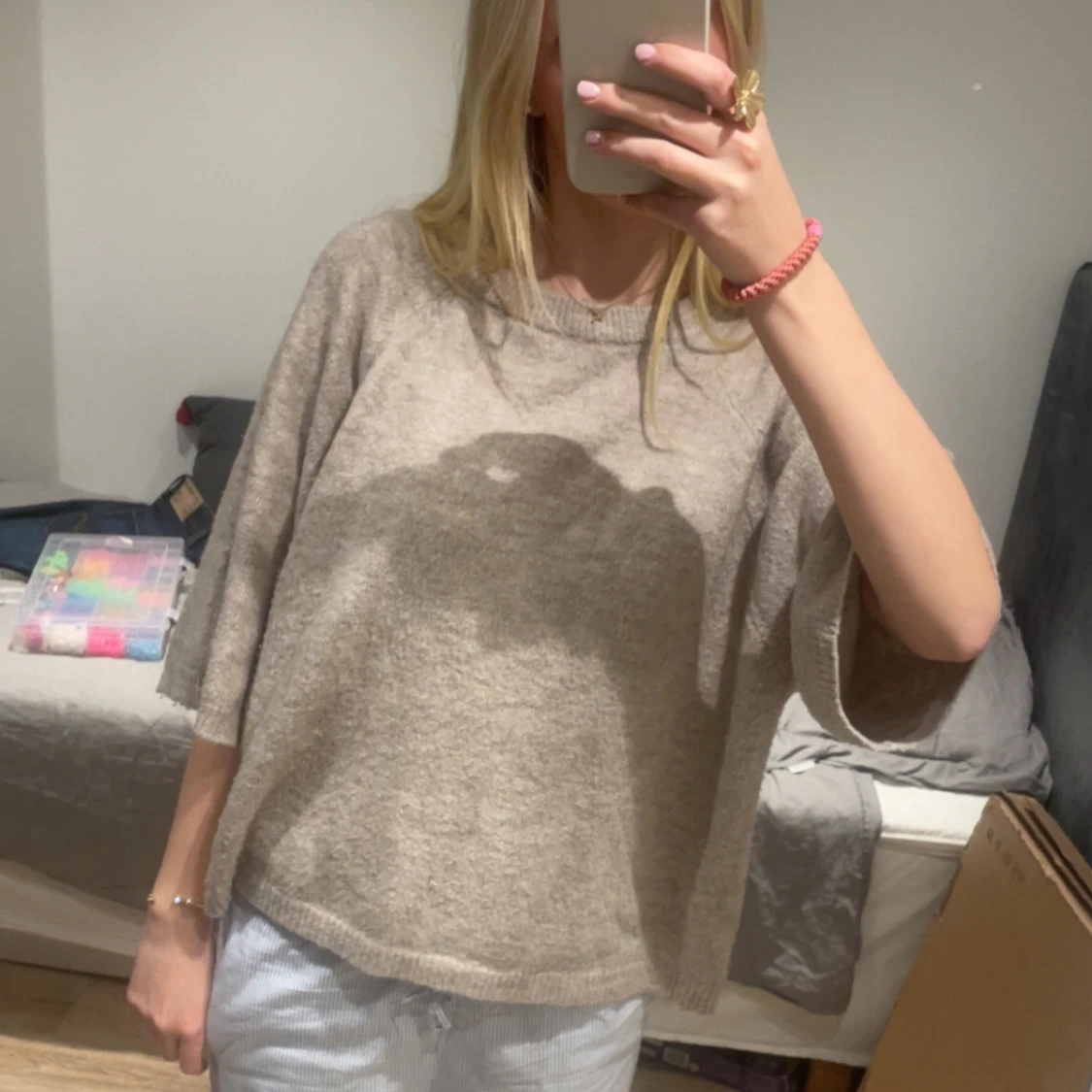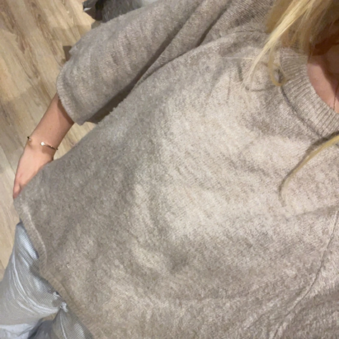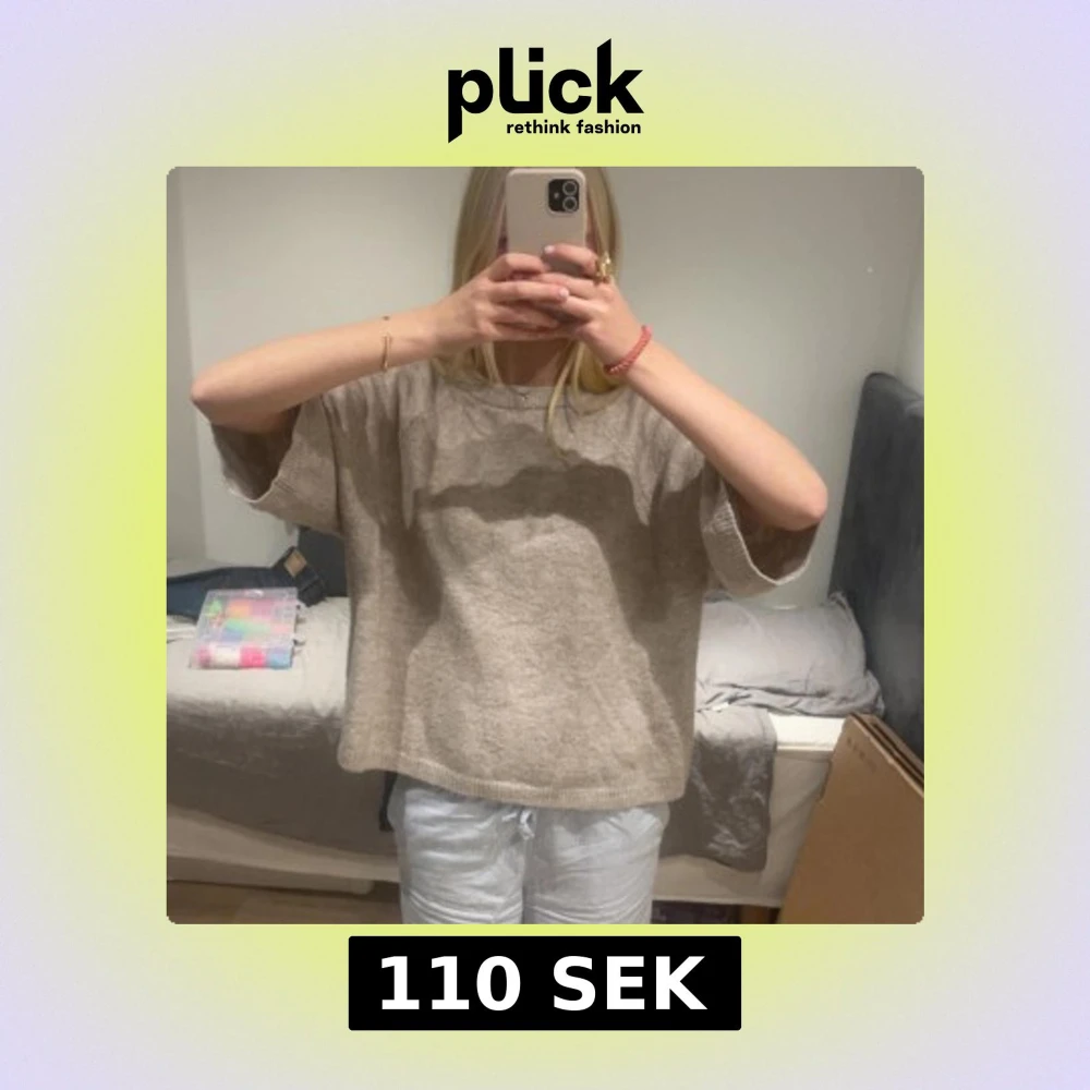 Mysig beige stickad tröja med rund halsringning och vida, lite kortare ärmar. Tröjan har en loose passform och är perfekt för lager-på-lager. Enkel och stilren design som funkar till allt.