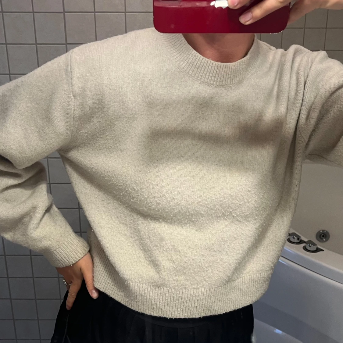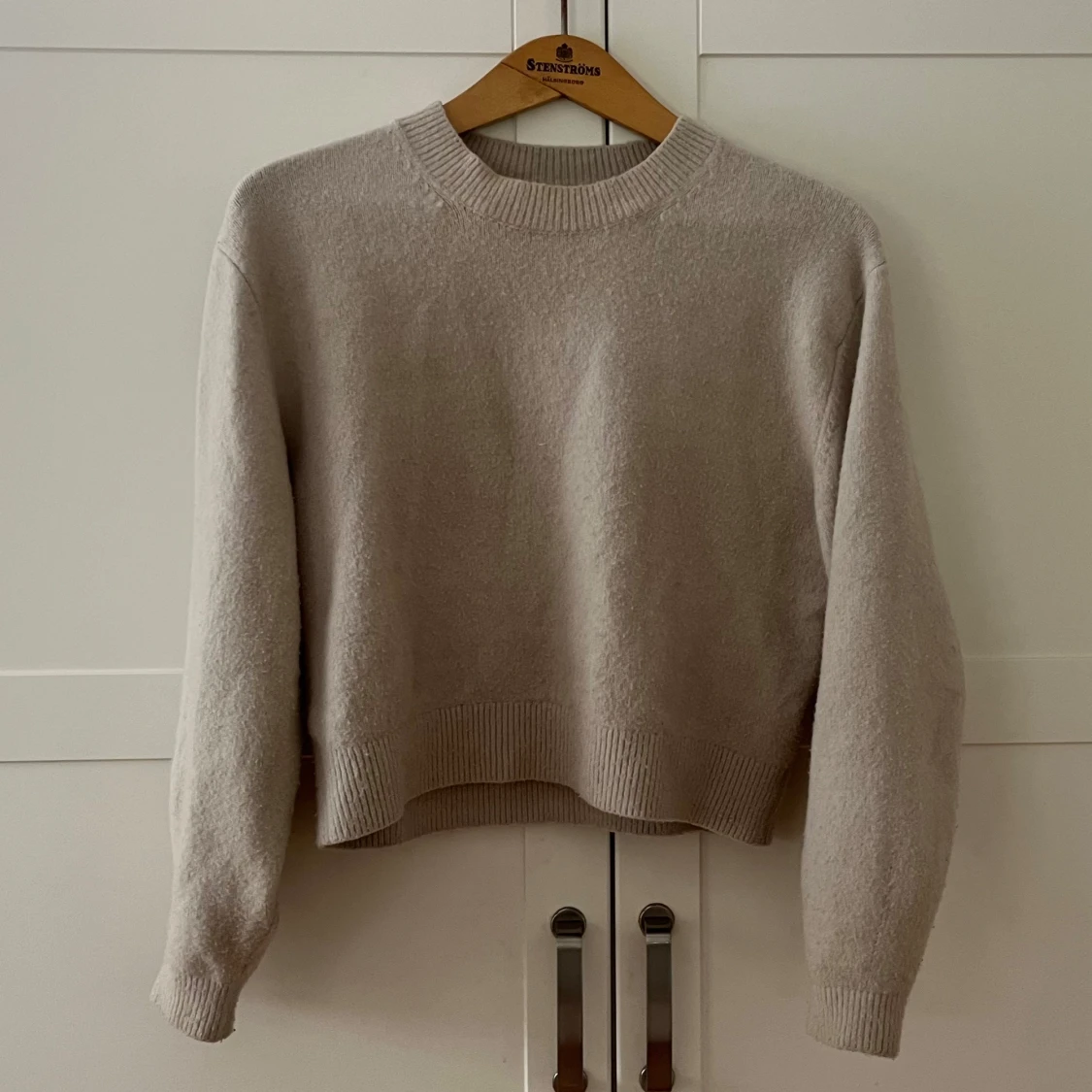 Supermjuk beige stickad tröja från & Other Stories. Modellen är croppad med bred ribbad mudd i nederkant och vid ärmslut. Klassisk rund halsringning och lång ärm, perfekt för lager-på-lager under kyliga dagar.