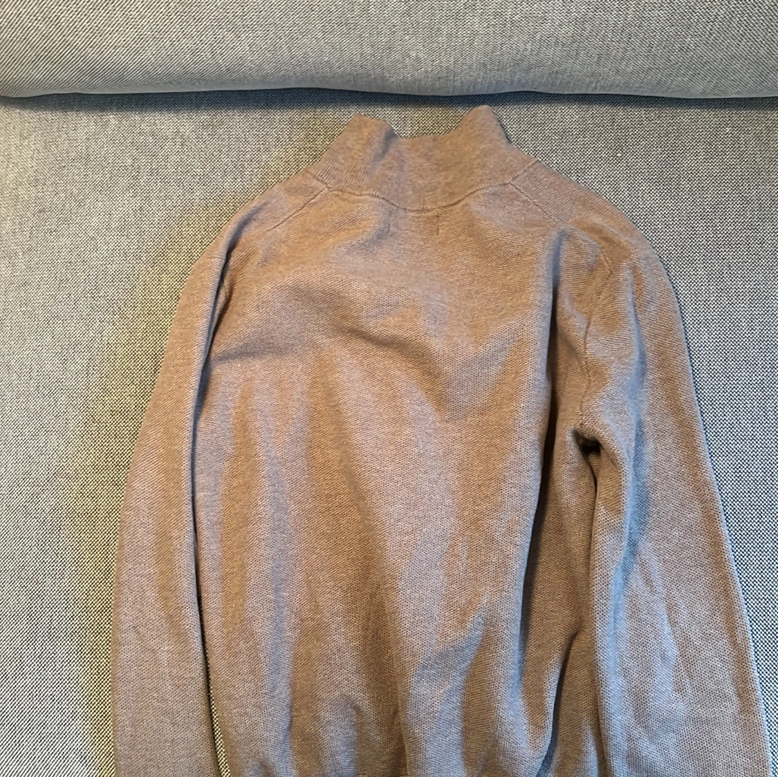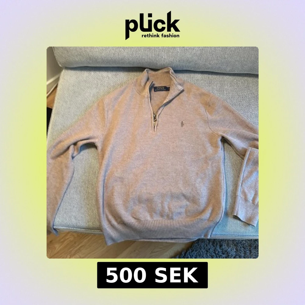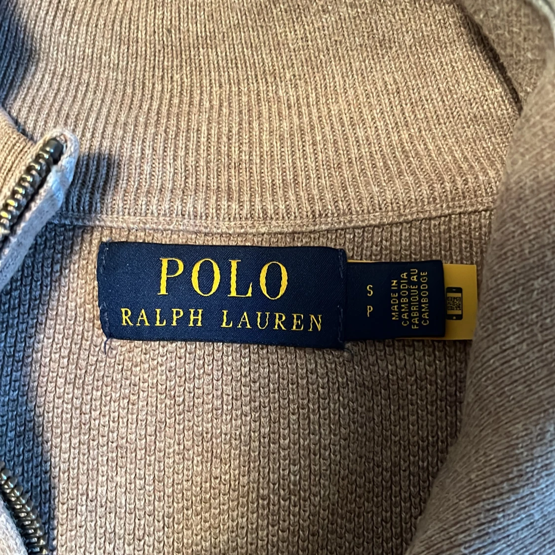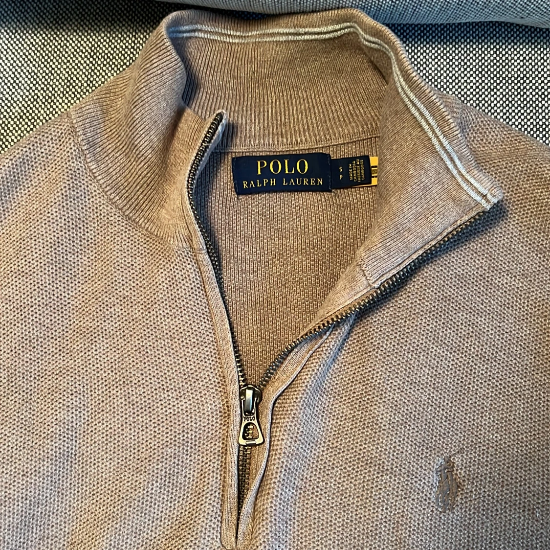 Säljer en snygg beige stickad tröja från Polo Ralph Lauren med halv dragkedja och broderad logga på bröstet. Tröjan har lång ärm, ribbade muddar och klassisk passform. Perfekt för lager-på-lager under höst och vinter.