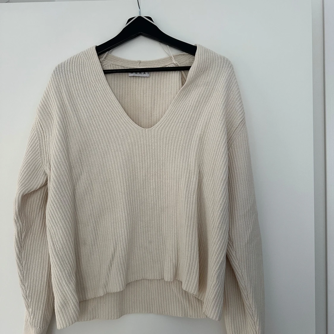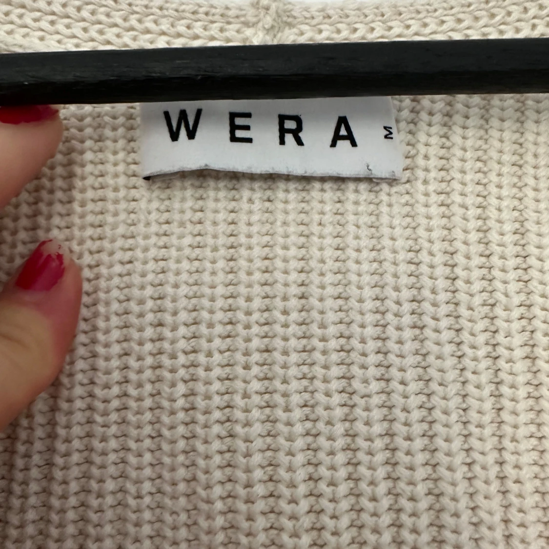 Supermysig beige stickad tröja från Wera med v-ringning och lång ärm. Tröjan har en relaxed passform och ribbad struktur som ger en chill vibe. Perfekt att slänga på sig när det är lite kyligt ute.