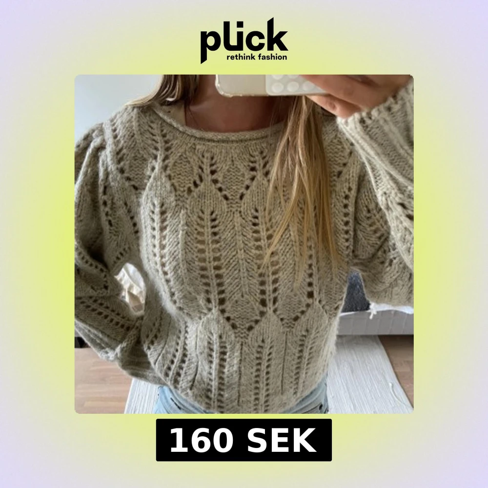 Superfin beige stickad tröja med snyggt hålmönster och rund hals. Tröjan har en lite loose passform och långa ärmar, perfekt att slänga på sig när det är kyligt. Den är mjuk och mysig, passar perfekt till jeans eller kjol.