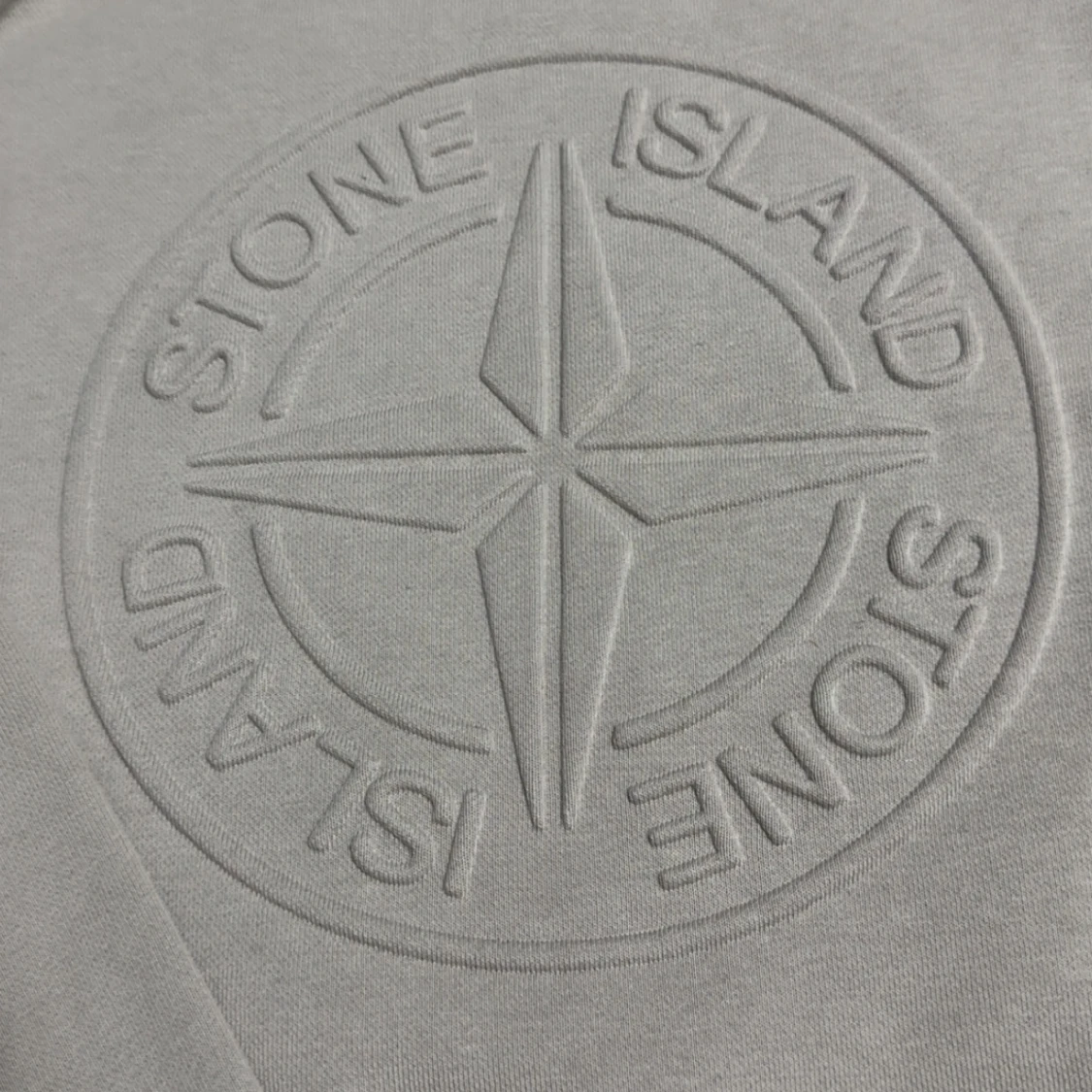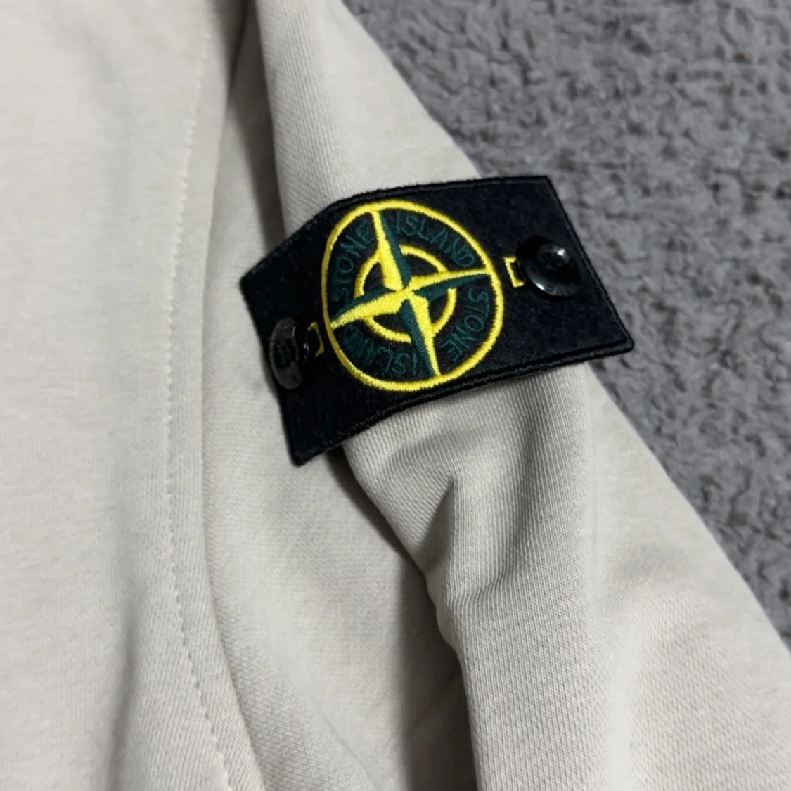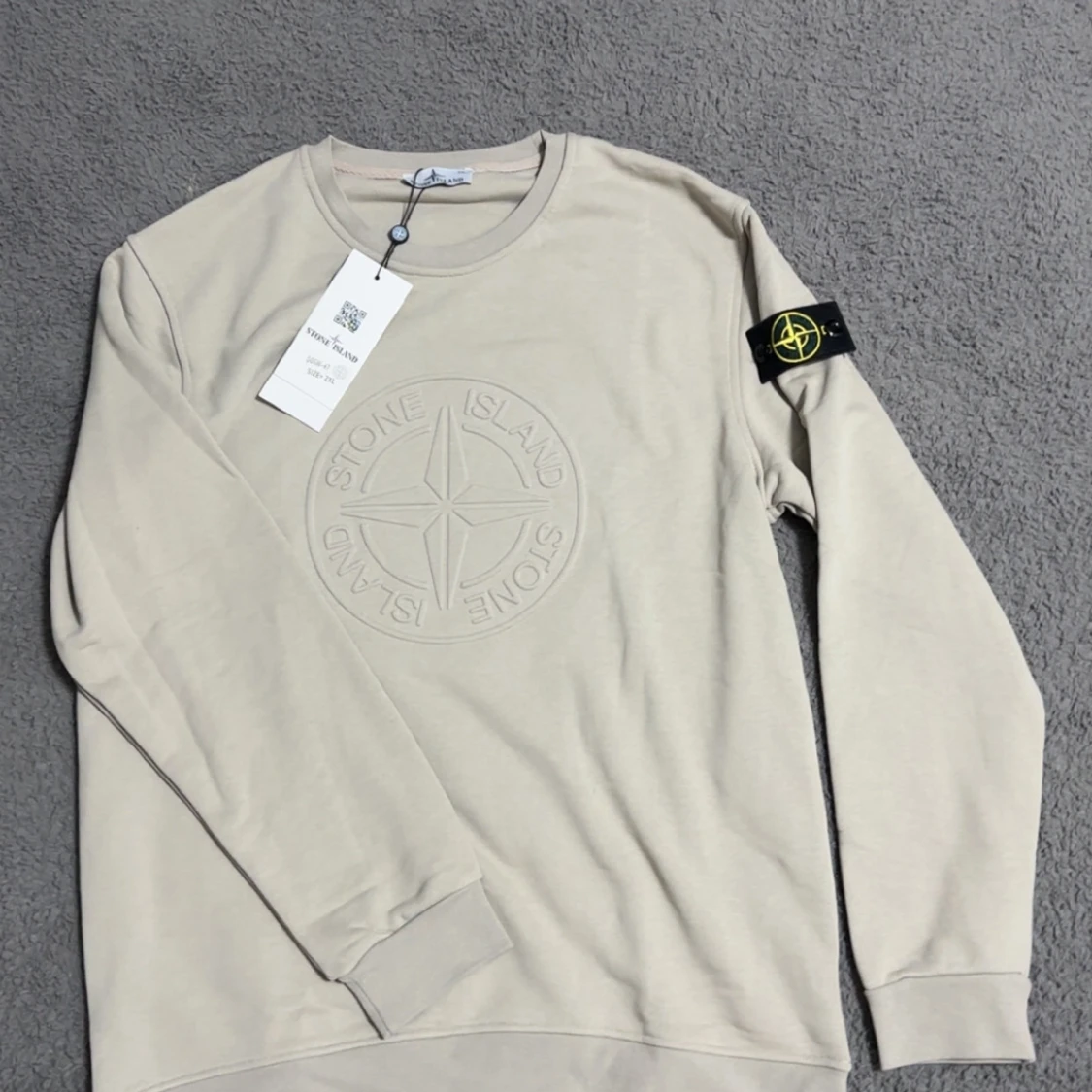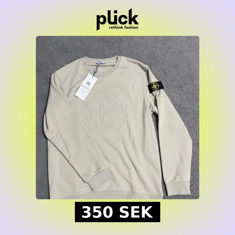 Snygg beige sweatshirt från Stone Island med stort broderat logomärke på bröstet och klassisk patch på ärmen. Tröjan har rund halsringning och långa ärmar, perfekt för en clean och stilren look.