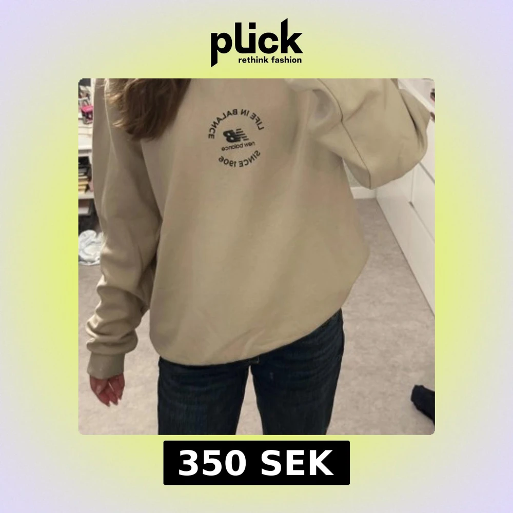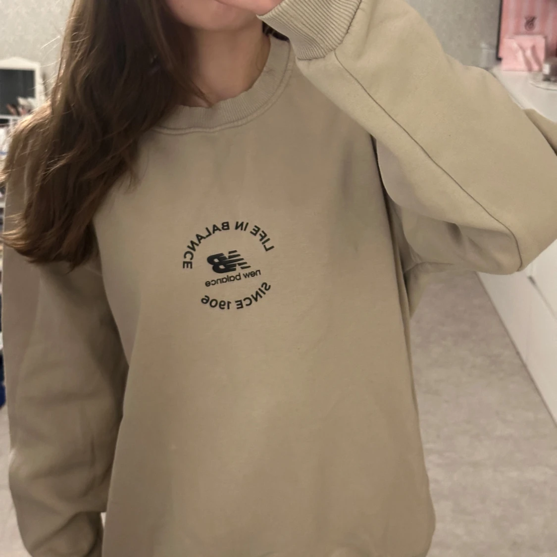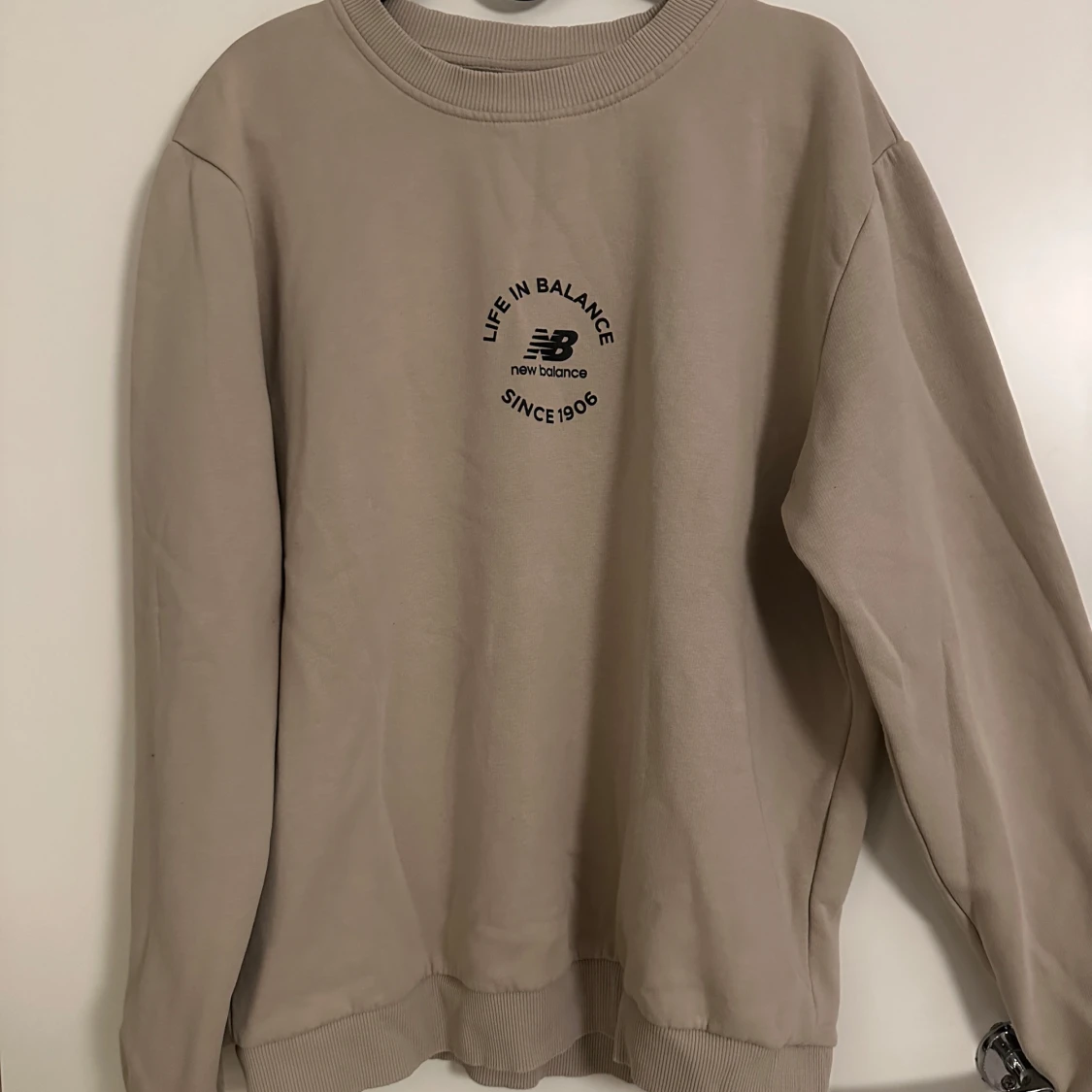 Säljer en beige sweatshirt från New Balance med svart tryck på bröstet där det står 'Life in Balance Since 1906'. Tröjan har rund hals, långa ärmar och ribbade muddar. Perfekt för en chill och avslappnad stil.