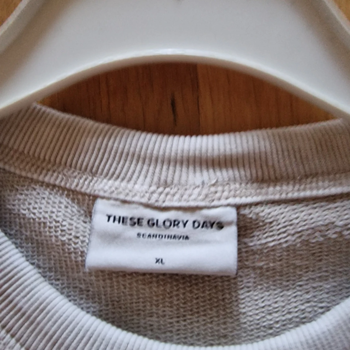 En stilren beige sweatshirt från These Glory Days i storlek XL. Tröjan har rund halsringning, ribbade muddar och är tillverkad i mjuk bomull. Perfekt för en avslappnad och clean look. Använd 1 gång.