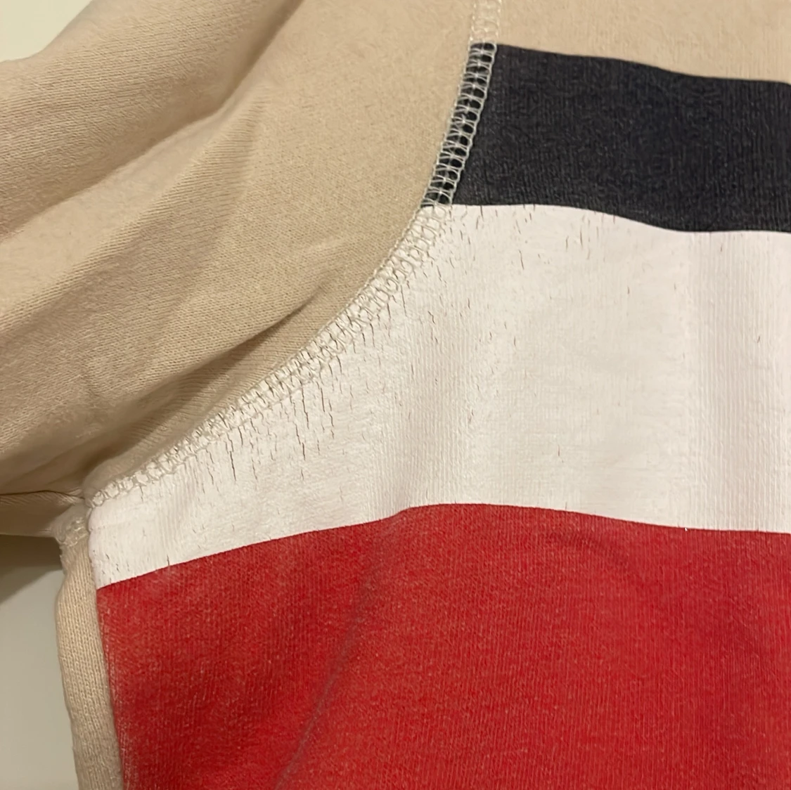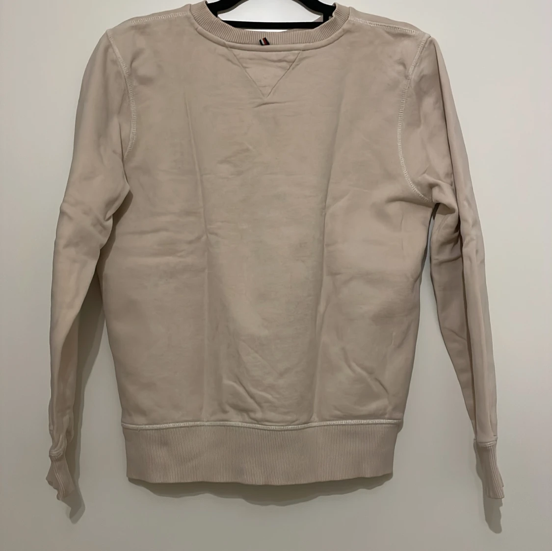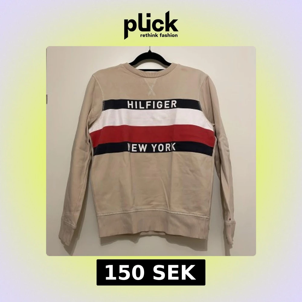 Säljer en beige sweatshirt från Tommy Hilfiger med texten 'Hilfiger New York' i svart, vitt och rött. Tröjan har långa ärmar och ribbade muddar vid ärmslut och nederkant. Perfekt för en avslappnad stil!
