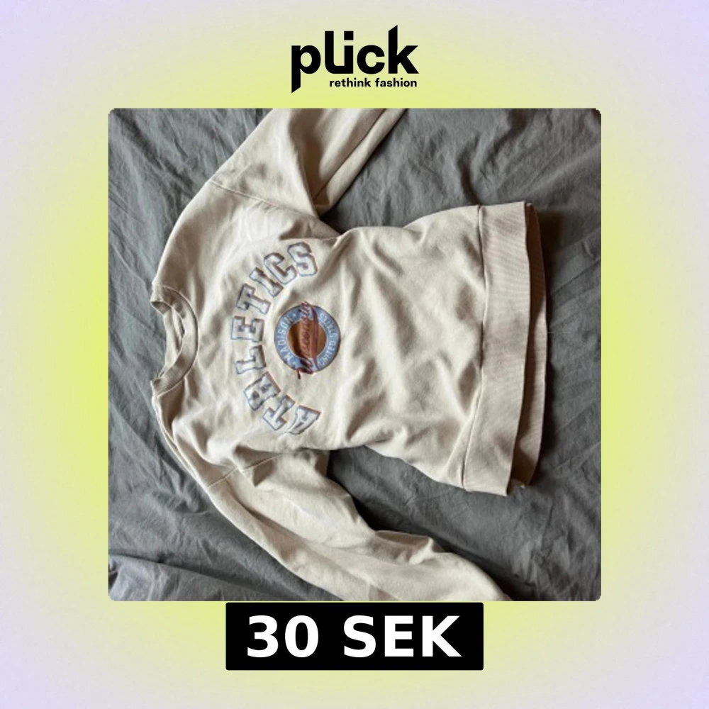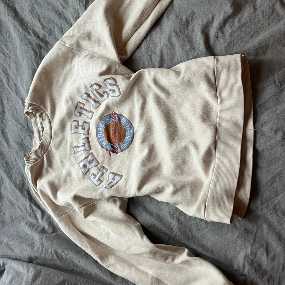 Säljer en beige sweatshirt med texten 'Athletics' och ett runt tryck i mitten. Tröjan har långa ärmar och ribbade muddar vid ärmslut och nederkant. Perfekt för en avslappnad stil.