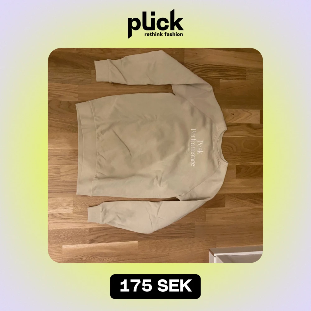 Säljer en stilren beige tröja från Peak Performance med broderad logga på bröstet. Tröjan har långa ärmar och en rund halsringning, perfekt för en avslappnad look. Passar bra till både jeans och joggers. Tröjan har dock en grön fläck på bröstet, fläcken syns knappt.