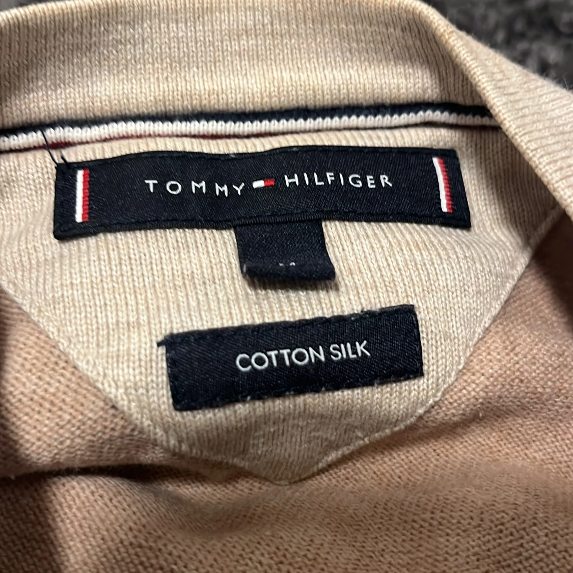 Säljer en stilren beige tröja från Tommy Hilfiger i en mjuk blandning av bomull och silke. Tröjan har en liten logotyp på bröstet och långa ärmar. Perfekt för en avslappnad och elegant look.