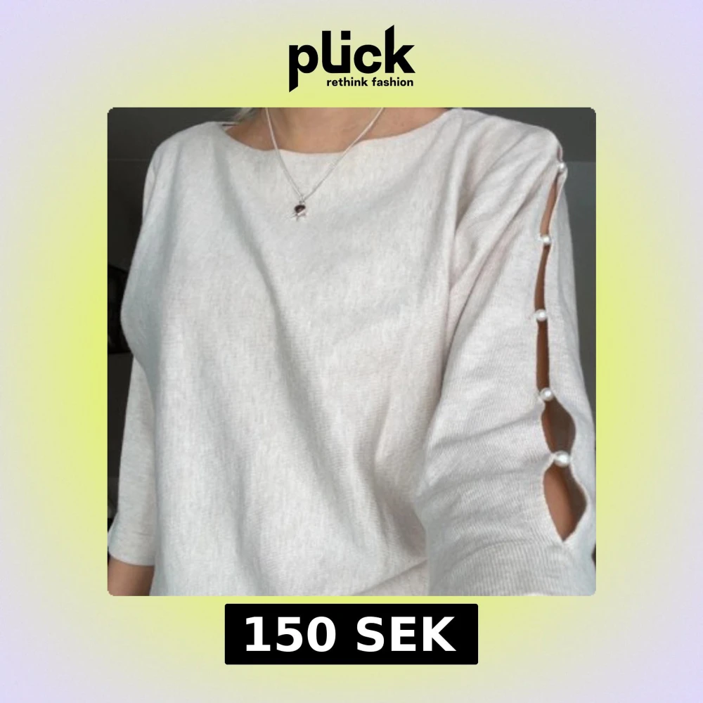 Säljer en stilren beige tröja med unika pärldetaljer längs ärmarna. Tröjan har trekvartsärm och en mjuk, bekväm passform. Perfekt för en elegant vardagslook.